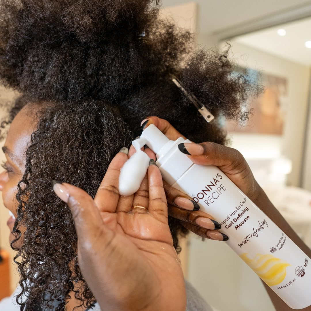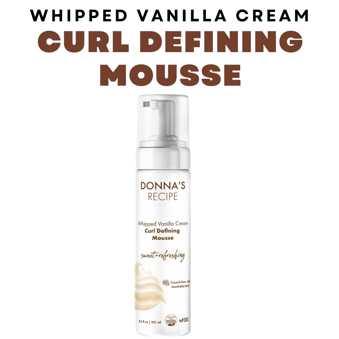 Details: Embrace your natural curls with Donna's Recipe Whipped Vanilla Cream Curl Defining Mousse. This lightweight, vegan-friendly formula provides a soft, touchable hold without any crunch, revealing healthy, luscious curls with long-lasting definition. Specially formulated for curly, coily, and wavy hair types, nourishing ingredients help enhance your natural texture. Enjoy the sweet, refreshing scent of whipped vanilla cream as you style. At 8.5 oz (251 ml), this bottle offers ample product for multiple applications.