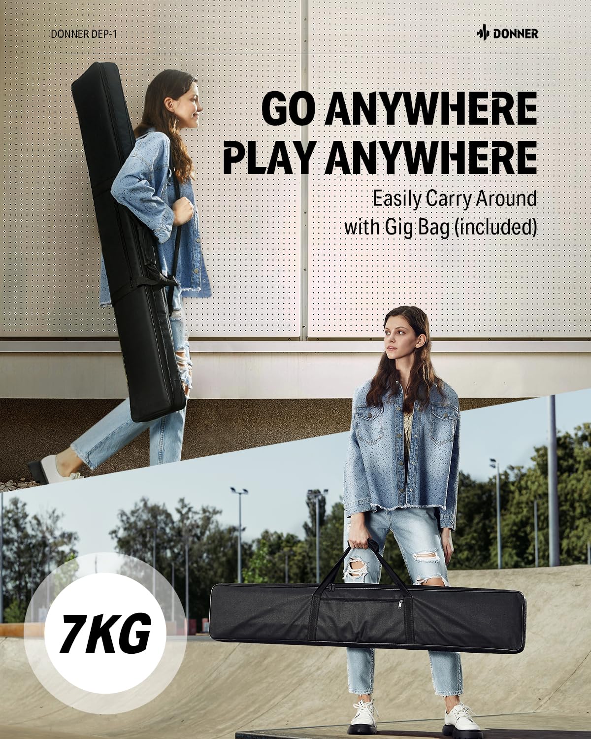 - 𝐄𝐧𝐡𝐚𝐧𝐜𝐞𝐝 𝐏𝐨𝐫𝐭𝐚𝐛𝐢𝐥𝐢𝐭𝐲: The DEP-1 electronic keyboard weighs a mere 7 kg, featuring sleek and smooth lines. The piano body is light but solid, making it suitable for indoor practice, and outdoor performance, and easy to store with a carrying case.