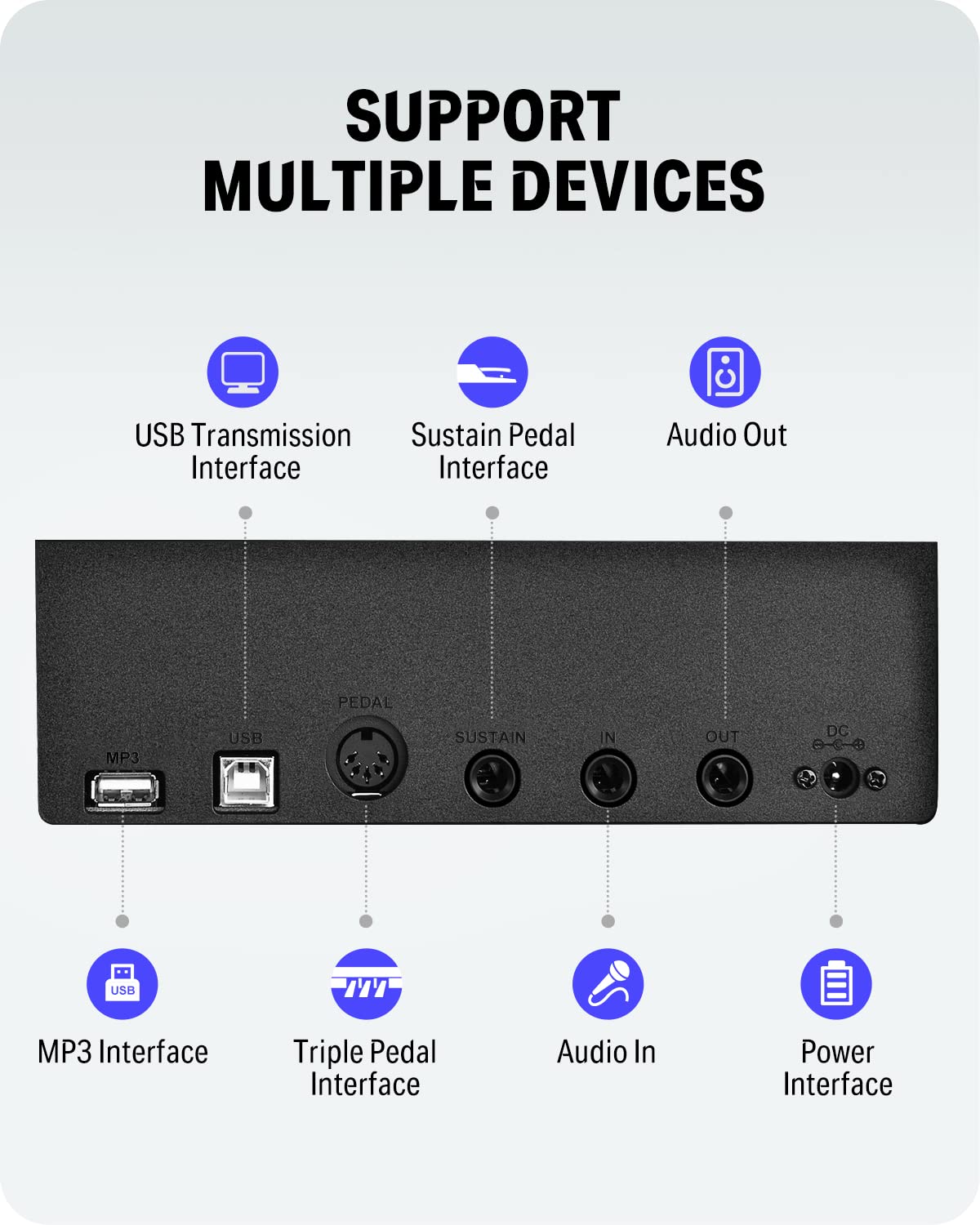 - 🎹【Double Keyboard & Control Panel】This 88 key weighted keyboard provides dual-tone mode for combining two voices together, like piano and drum, inspiring to make a new creation. Panel includes sustain pedal, triangle pedal and audio inputs & outputs, perfectly used for music arrangement and an ensemble.Eludes sustain pedal, triangle pedal and audio inputs & outputs, perfectly used for music arrangement and an ensemble.