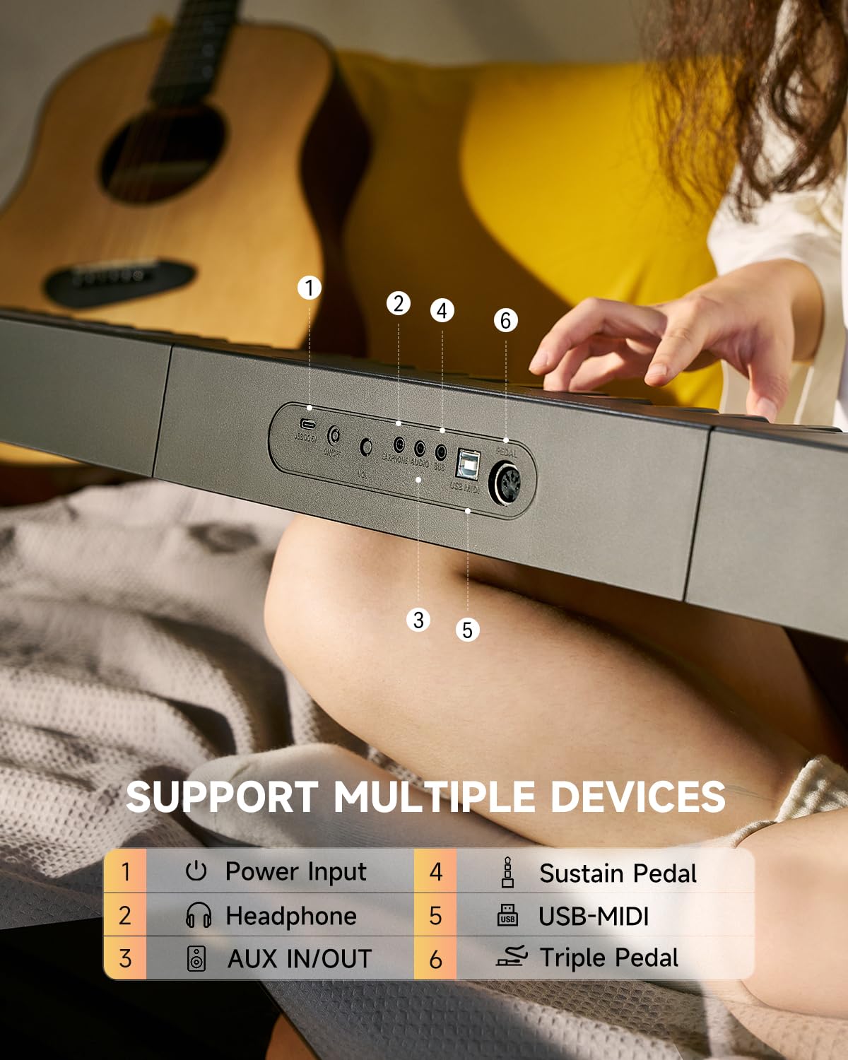 - ๐๐๐๐๐ก๐ข๐ง๐ ๐๐จ๐๐: With one key, the keyboard splits into two sections, allowing beginners to play different tones in each section to explore and compare sounds; Paired with the recording function, this mode is ideal for music creationโplay strings or drums in one section and piano in the other; The Headphone Mode also ensures private practice without disturbing others