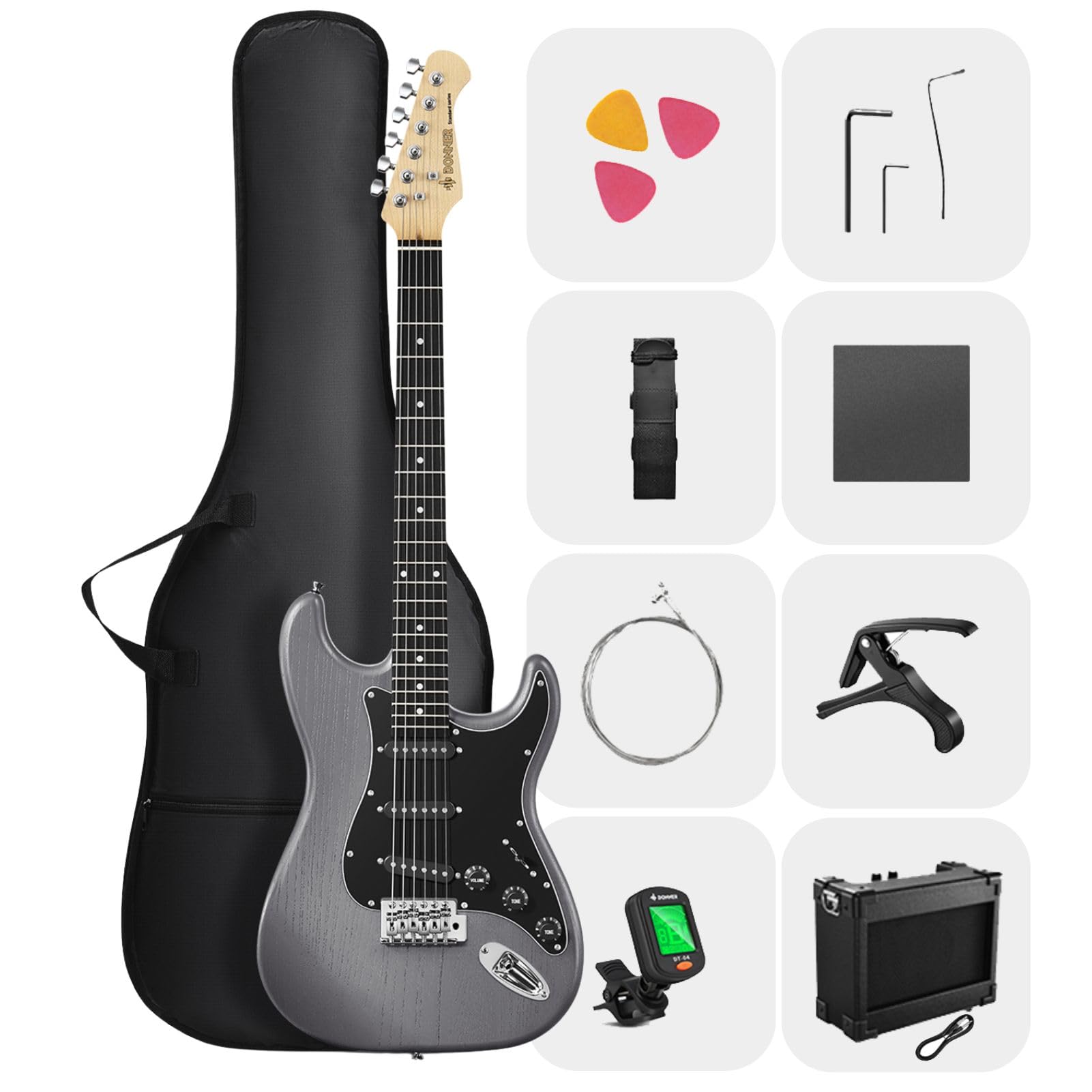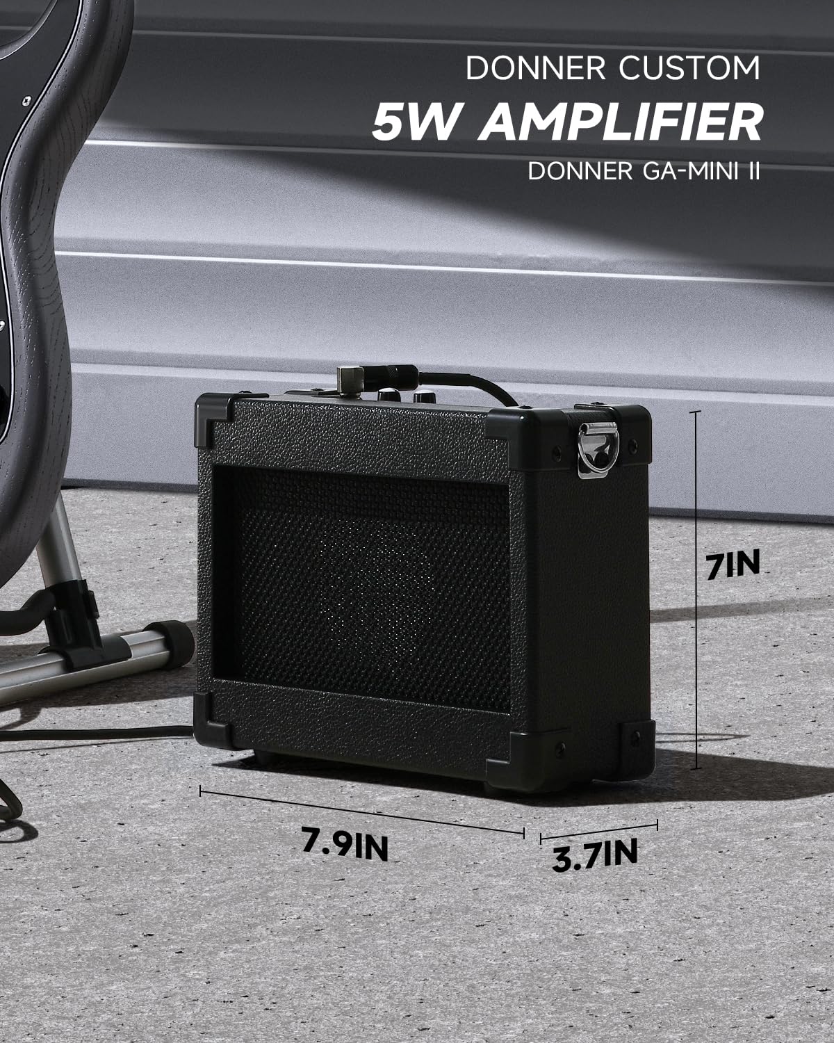 - COMPLETE BEGINNER’S PACKAGE:Open the box, and you’re ready to play. This beginner kits includes the DST-80 electric guitar, custom 5W amplifier, durable gig bag, capo, strap, extra strings, digital tuner, amp cable, picks, and access to free online lessons from Donner to help you grow and shine
