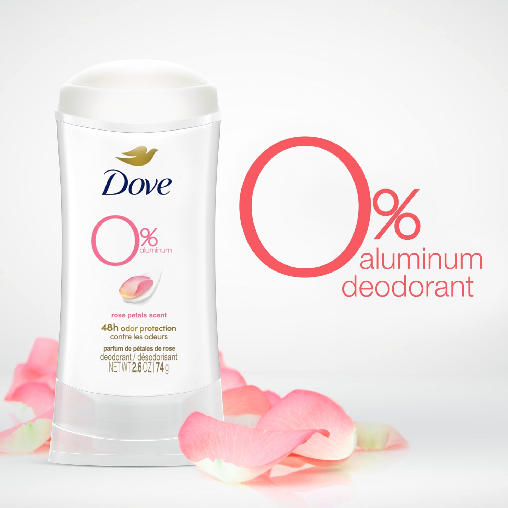 Details: To keep your underarms feeling their best every day. they need the same love and care you give the rest of your body. Dove 0% Aluminum Deodorant Stick Rose Petals is the most skin kind aluminum free deodorant. with no compromise on odor protection. So. when you use this 0 percent alcohol ethanol deodorant formula. you always get the protection you’d expect. and the care your delicate underarms deserve from an aluminum free deodorant. Enriched with ¼ moisturizers. this gentle. non irritating deodorant without aluminum works to give you soft. smooth underarms by caring for your skin. In addition to underarm care. Dove 0% aluminum deodorant provides effective odor protection. Designed to protect your underarms from odor for up to 48 hours. one application of this 0 percent alcohol ethanol deodorant formula will help you get on with your day worry free. Smelling fresh and clean all day is a great way to boost your confidence. Infused with a delicate floral rose petal scent. this deodorant without aluminum gives long lasting freshness with every application. leaving you feeling and smelling great. no matter what the day brings. To get the most out of your deodorant stick without aluminum. swipe evenly onto clean. dry skin after showering and enjoy fresh smelling underarms. Made to be small and compact. this aluminum free deodorant stick is ideal when you’re on the go. Just pop into purses and desk drawers for easy access whenever you’re in need of a quick refresh. Dove believes that no young person should be held back from reaching their full potential. Since 2004. Dove has been building self esteem in young people and by 2030. they’ll have helped ¼ billion through our educational programs.