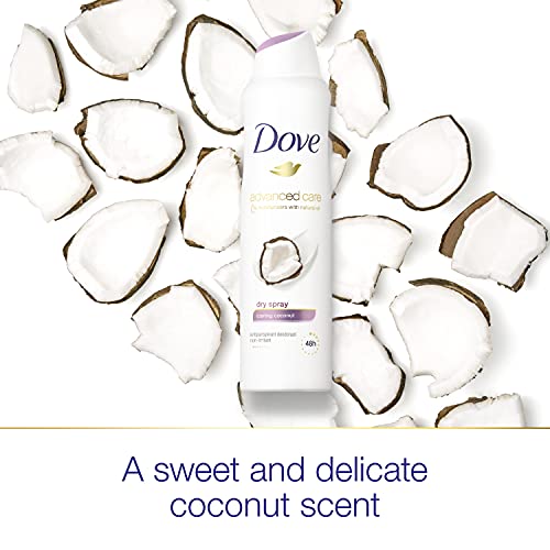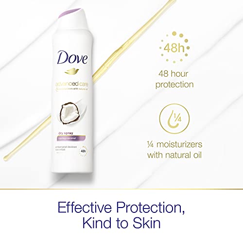 - EFFECTIVE PROTECTION AND KIND TO SKIN: Dove Advanced Care Caring Coconut Dry Spray Antiperspirant Deodorant keeps your underarms dry and odor-free for up to 48 hours while being kind to your skin