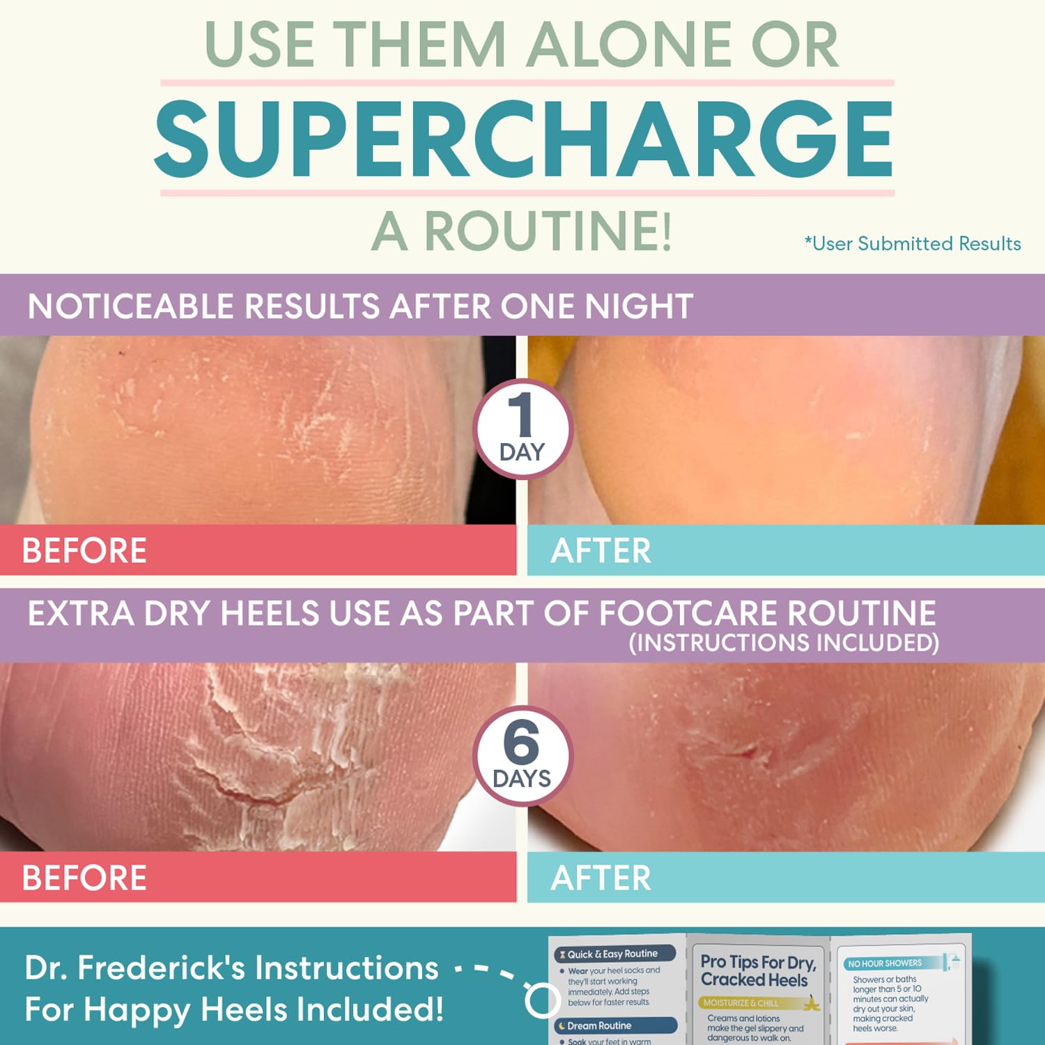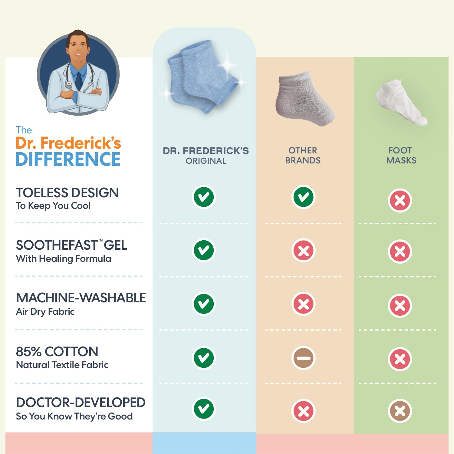 - Trustworthy And Doctor-Developed: Dr. Frederick’s Original’s top priority is your results, which means creating the best possible product for you. That’s why we stand by our products with the industry-leading pledge If our Moisturizing Heel Socks don’t relieve dry cracked heels in 30 days or less, we're dedicated to finding a satisfactory solution.