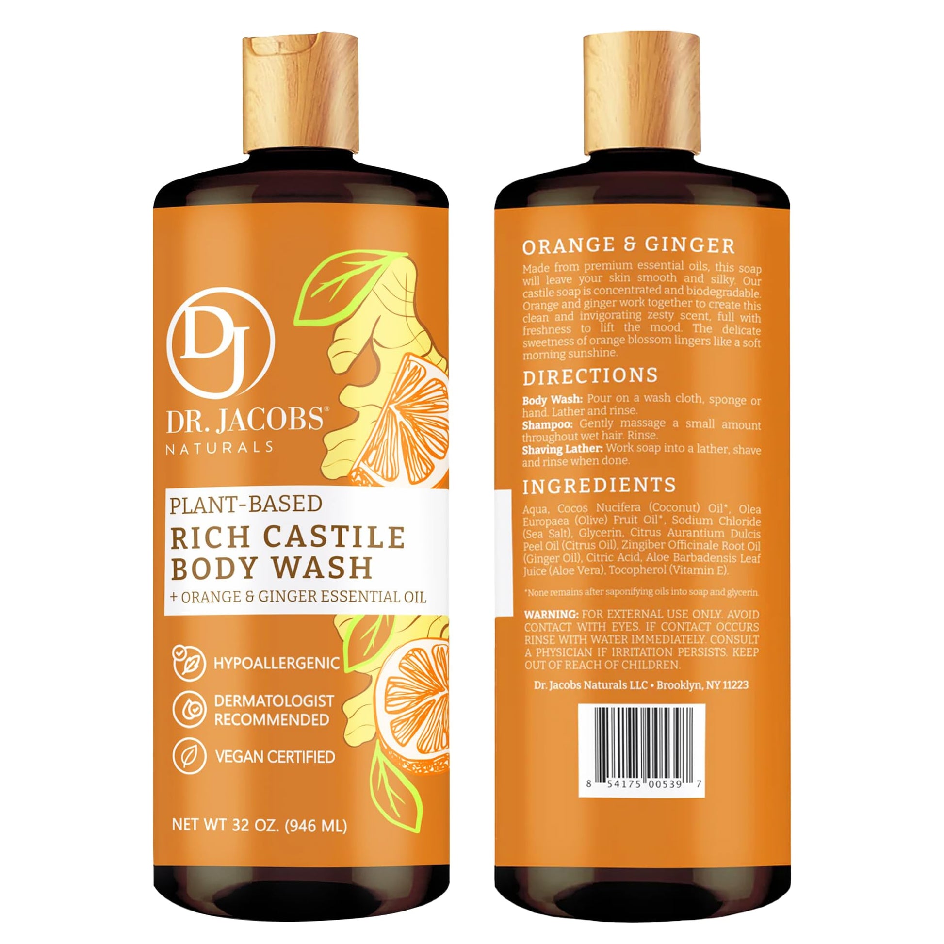 DR. JACOBS NATURALS Castile Orange & Ginger All-Natural Body Wash for Moisturizing Dry and Sensitive Skin Shampoo with Plant-Based Ingredients Gluten, Preservatives-Free Formula - 32 oz