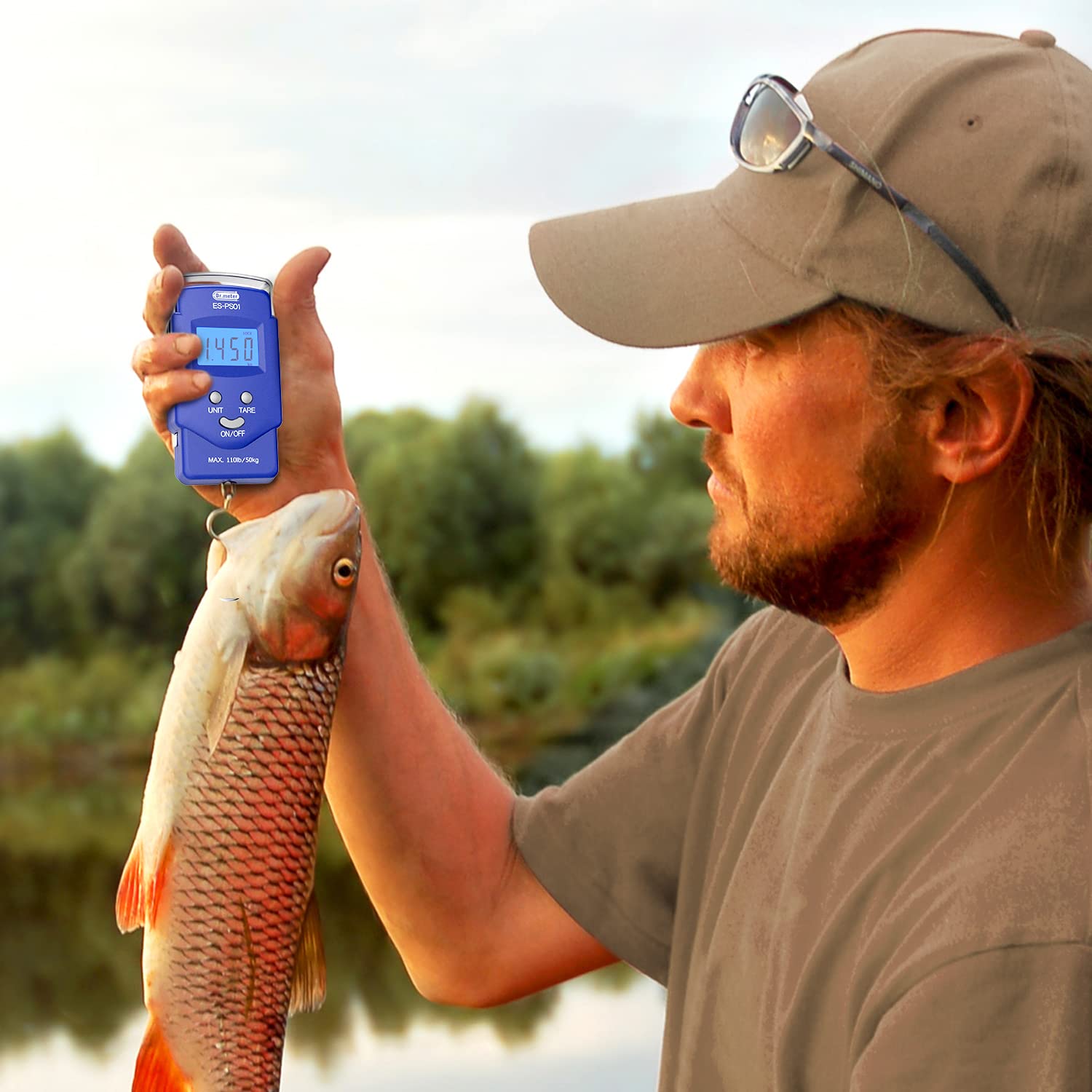 Dr.meter Fish scale, Backlit LCD Display 110lb/50kg PS01 Fishing Scale with Measuring Tape, Electronic Balance Digital Fishing Postal Hanging Hook Scale with 2 AAA Batteries-Fishing Gifts for Men,Blue
