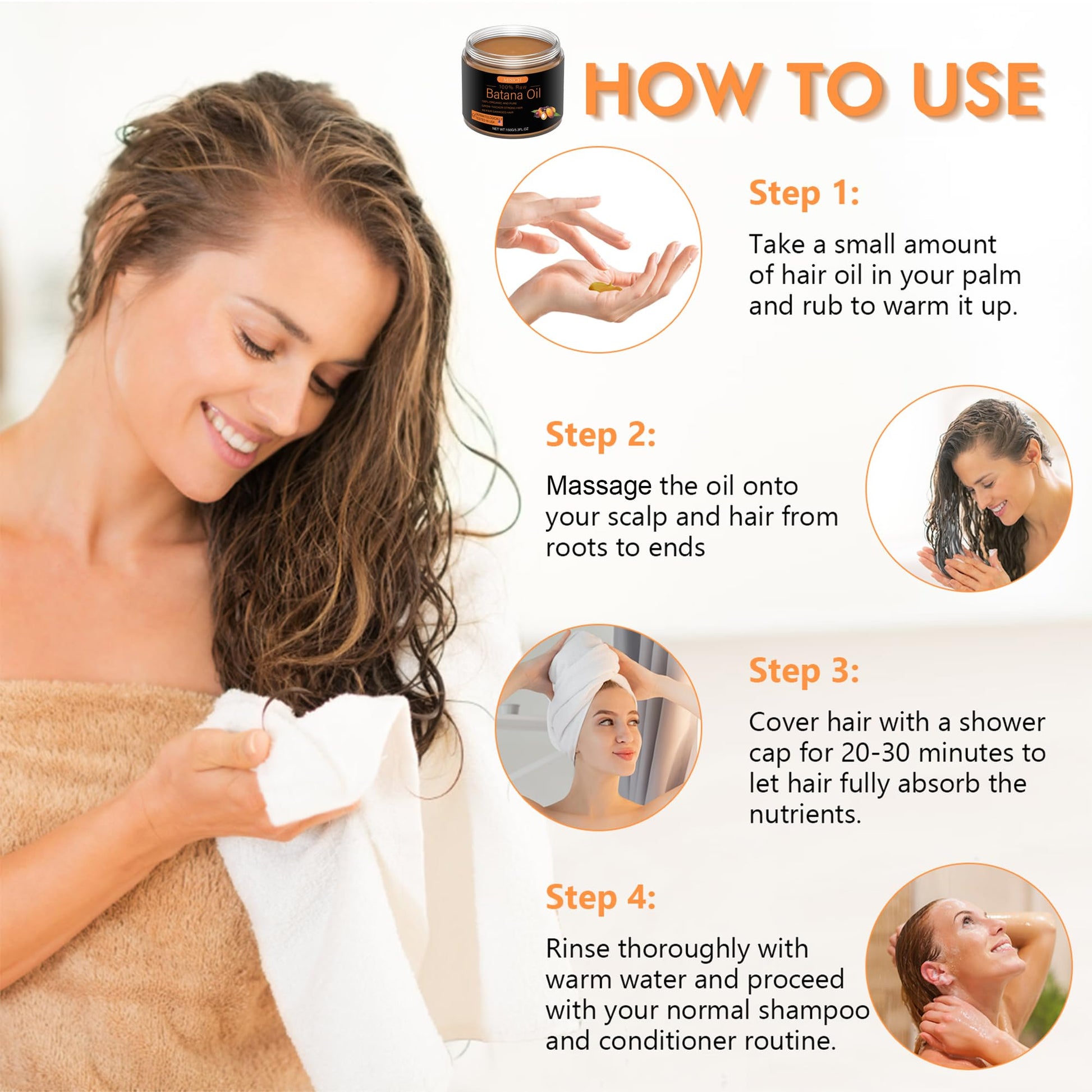 - Simple to Use: Massage a generous amount of this hair growth oil into scalp for 3-5 minutes, leave it on and cover with a showercap for 20-30 minutes, then rinse with warm water. Use it as a regular part of hair care routine to get the best performance to nourish, moisturize, fortify and preven hair damage