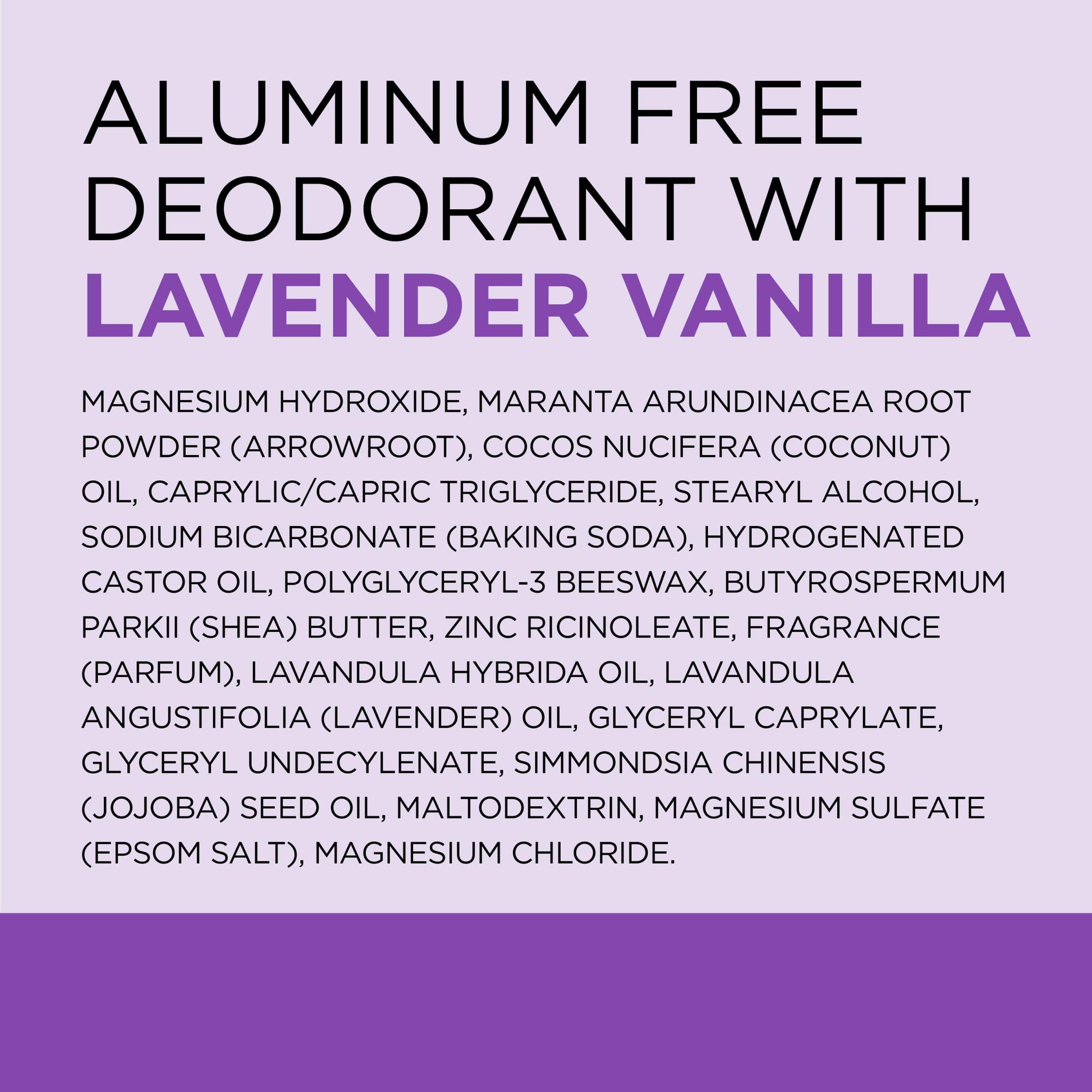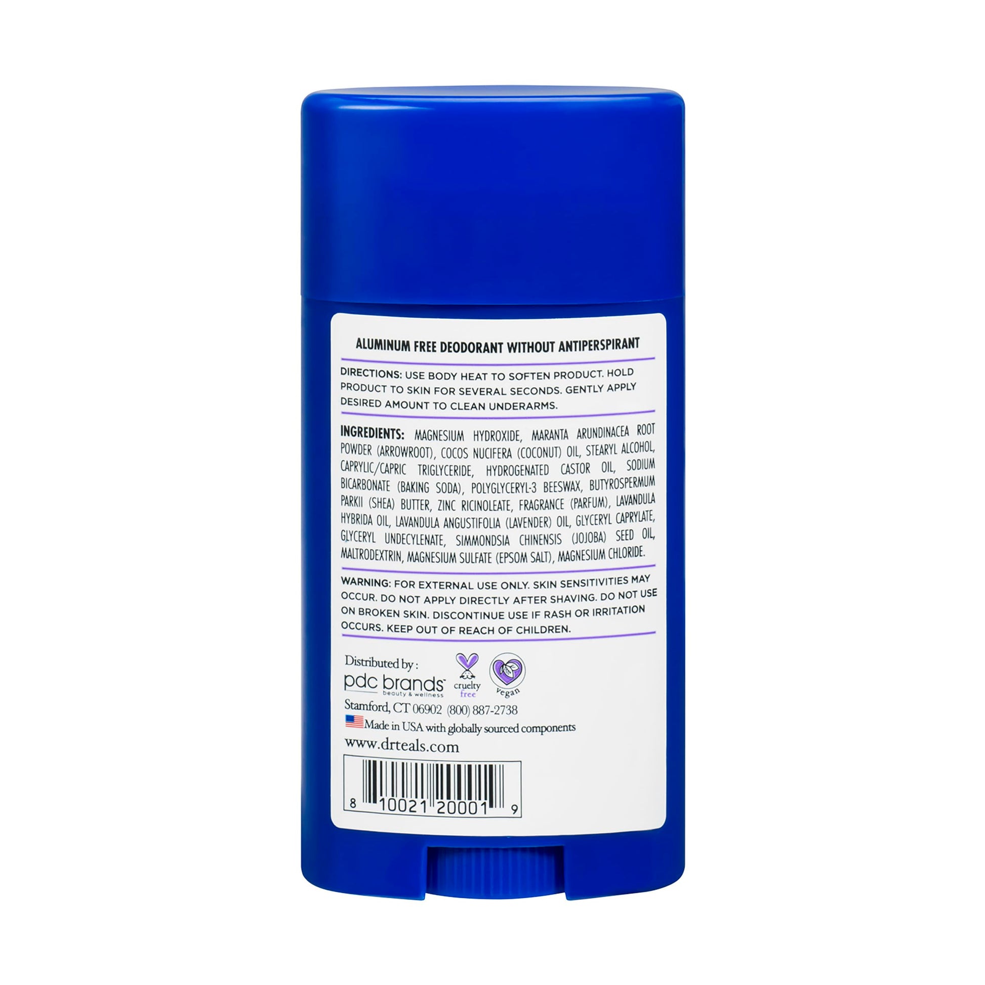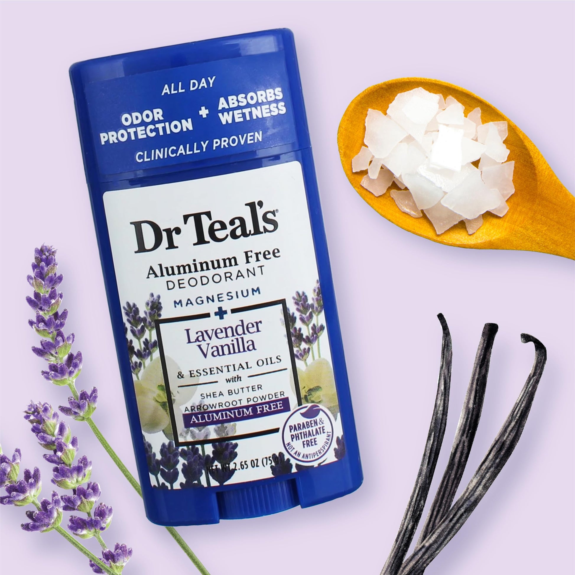 Details: Keep your skin feeling and smelling great all day with Dr Teal's Aluminum-Free Deodorant with Lavender & Vanilla. We crafted our clinically proven formula to harness the strength of magnesium, an essential mineral for your body and a powerful deodorizer, and arrowroot powder and baking soda for all-day wetness absorption. Infused with essential oils, coconut oil, jojoba oil, and shea butter, the gentle, aluminum-free formula provides all day wetness absorption. Apply daily to effectively fight odor while soothing your senses with lavender and vanilla. Dr Teal's Aluminum-Free Deodorant with Lavender & Vanilla is paraben-free, phthalate-free, and cruelty-free.