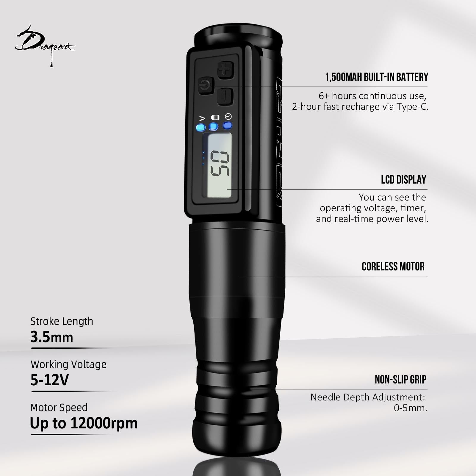 - 【POWERFUL MOTOR】Experience unmatched performance with the Dragoart custom coreless motor. 3.5mm stroke length, 10V,10000rpm and up to 12V,12000rpm. Archer wireless tattoo machine gun delivers more smooth speed changes, minimal vibration, and reliable operation. Needle Depth Adjustment: 0-5mm.