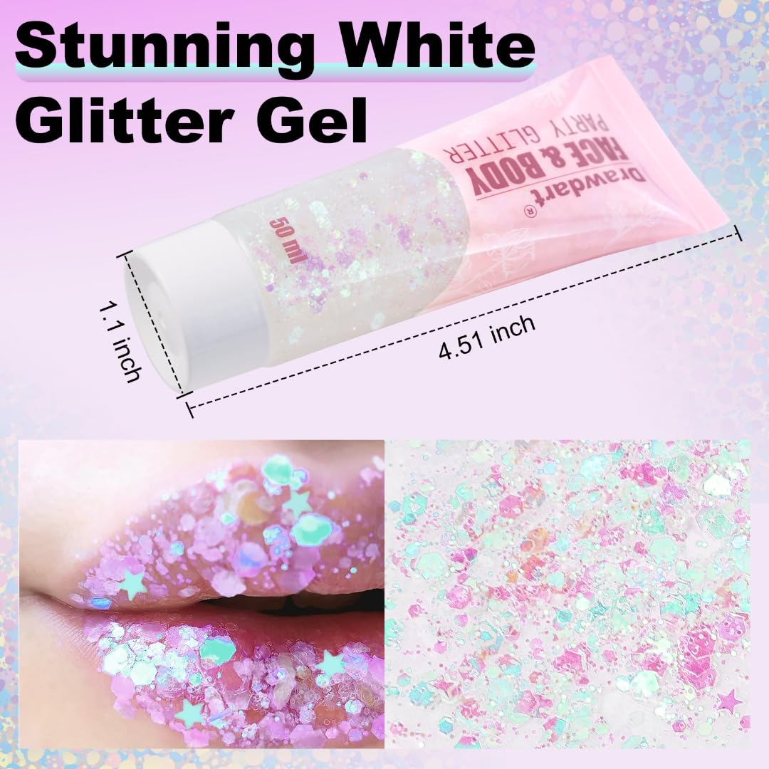 Drawdart Face & Body Glitter, Cosmetic-Grade Glitter Gel- Singer Concerts Disco Festival Rave Accessories, Chunky Hair Sparkling Glitter Gel for Women, Vegan & Cruelty Free- 50ml (White)