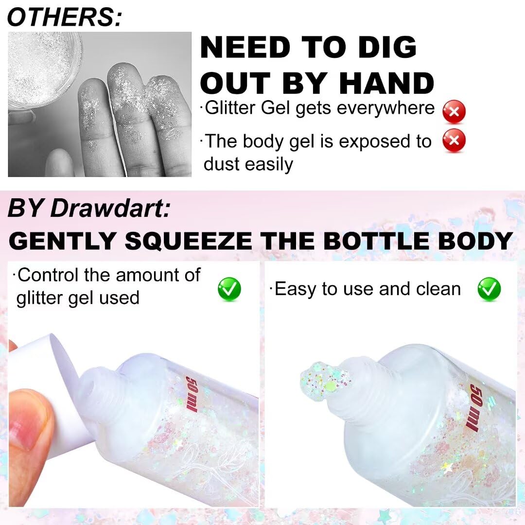 - 【Easy to Use and Remove】: Because face and body glitter gel is sticky, you don't need to use glue when using it, goes on smoothly after easy squeezing out. The glitter can be applied over face paint designs or body shimmer, which removes easily with makeup removal cloths, or a cotton pad with makeup remover