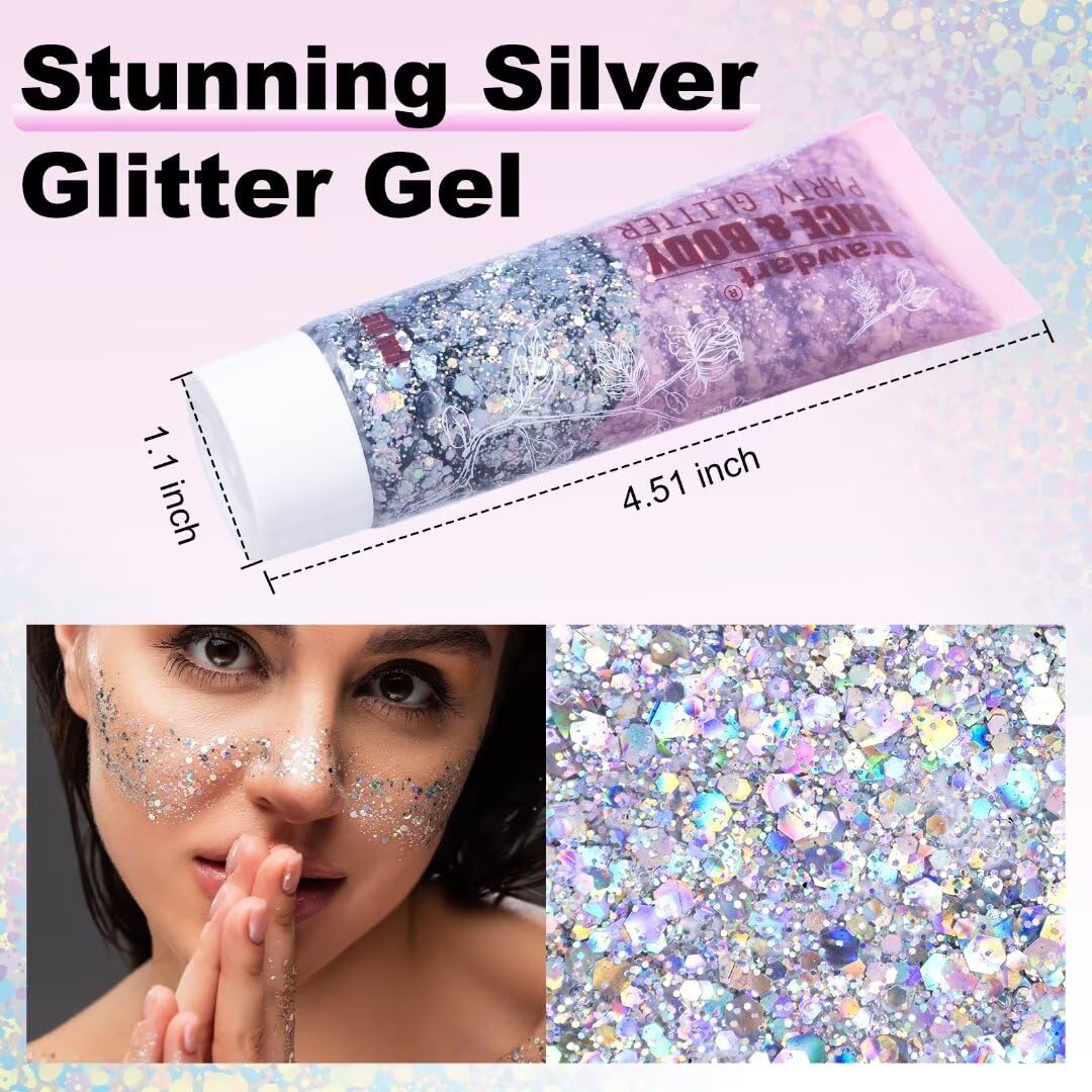 Drawdart Face & Body Glitter,Cosmetic-Grade Holographic Glitter Gel,50ml Silver Hair Glitter Gel,Rave Glitter,Mermaid Makeup Glitters for Women - Vegan & Cruelty Free