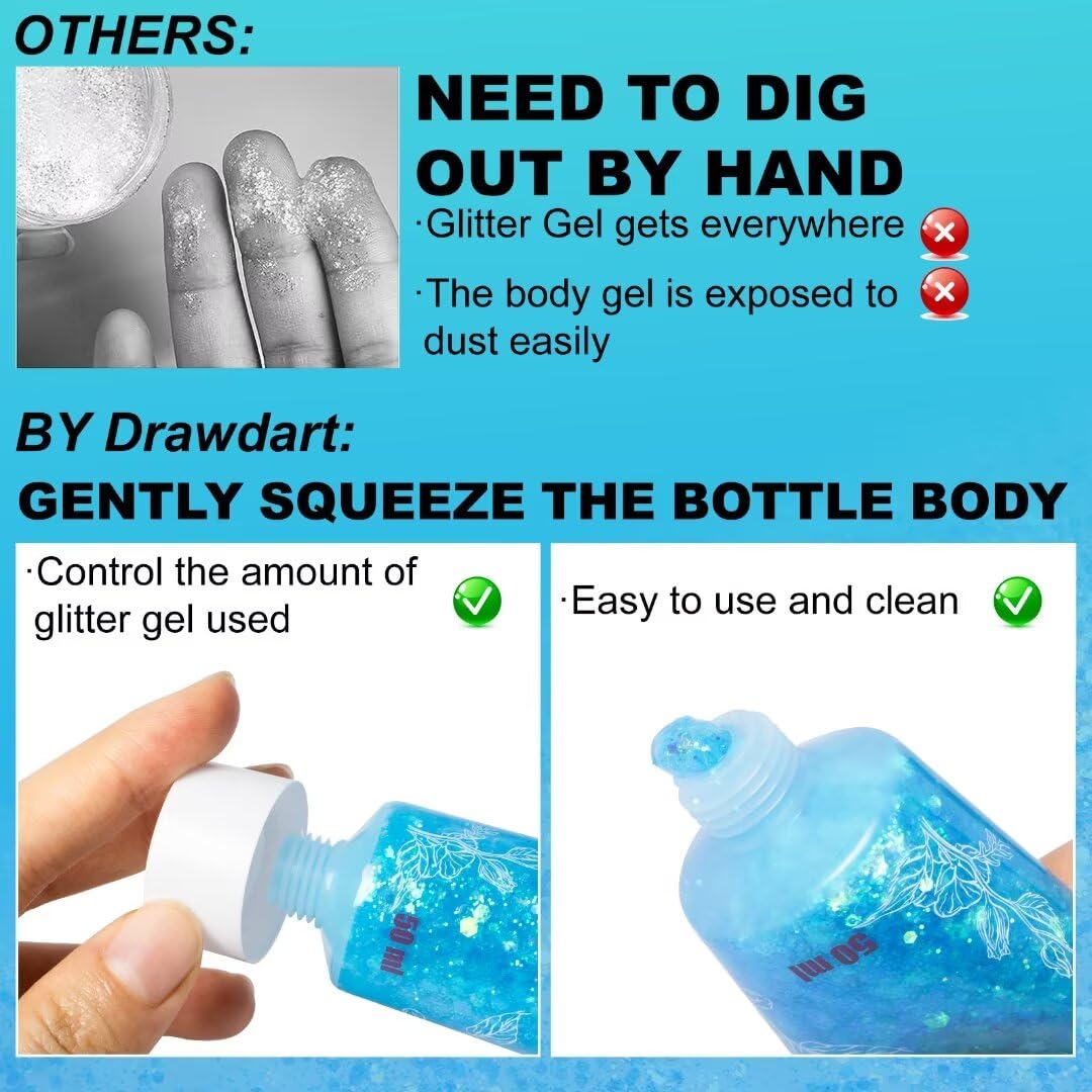 - 【Iridescent Body Glitter Gel】:Light Blue chunky glitter blends with plenty of different shapes and sizes of chunky and fine glitters in a gel base,great for a coverage with a iridescent effect.This shimmer takes hair and make-up to another level,making your makeup more attractive and eye-catching.