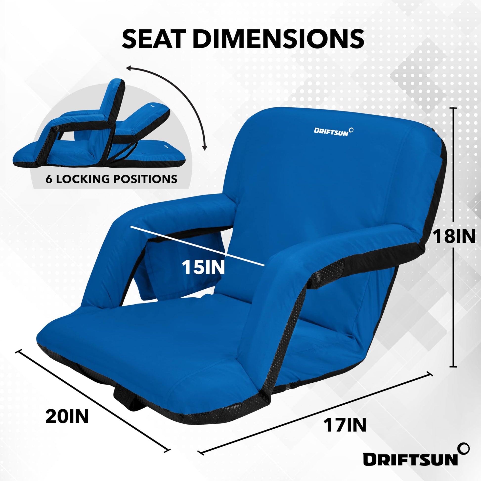 Get the ultimate reclining bleacher chair for camping, outdoor concerts, sporting events, days at the beach or the perfect picnic time seat. The Driftsun Reclining Stadium Seat features a durable polyester-covered padded cushion mounted on a sturdy steel frame with a non-slip padded bottom. The high-density internal PU foam offers the perfect firmness to prevent stress on your back and buns.