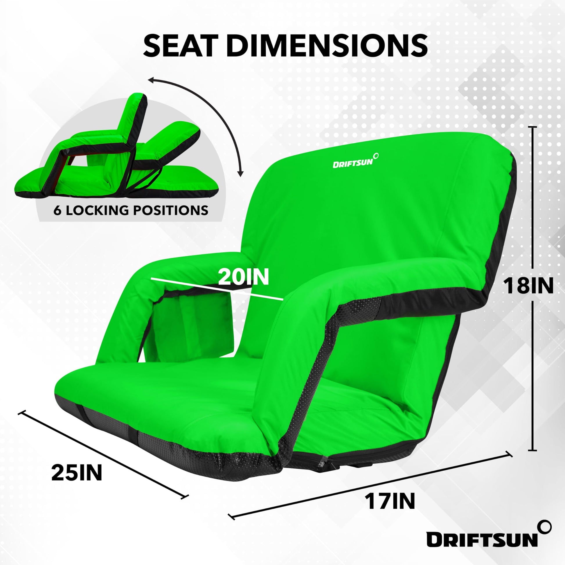 - PORTABLE STADIUM CHAIR - The Driftsun reclining bleacher seat with backrest has adjustable backpack straps to transport to the game without the hassle. Perfect for stadium seats, park benches, backyards, and picnics!