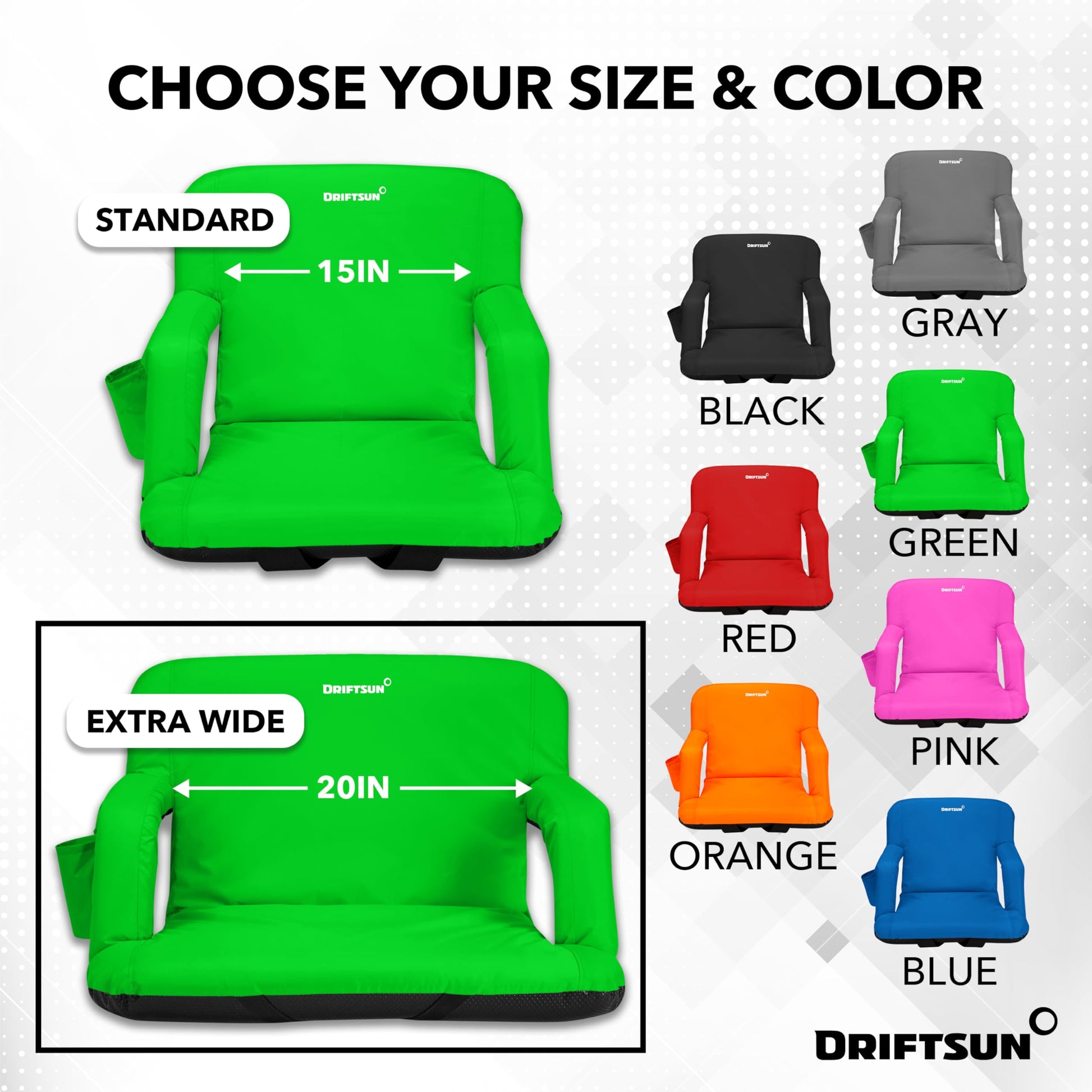 - EXTRA WIDE STADIUM SEAT - The Driftsun extra wide stadium chairs are 5 inches wider than the standard size for added room and comfort. These are the best stadium seats for bleachers with back support on the market.