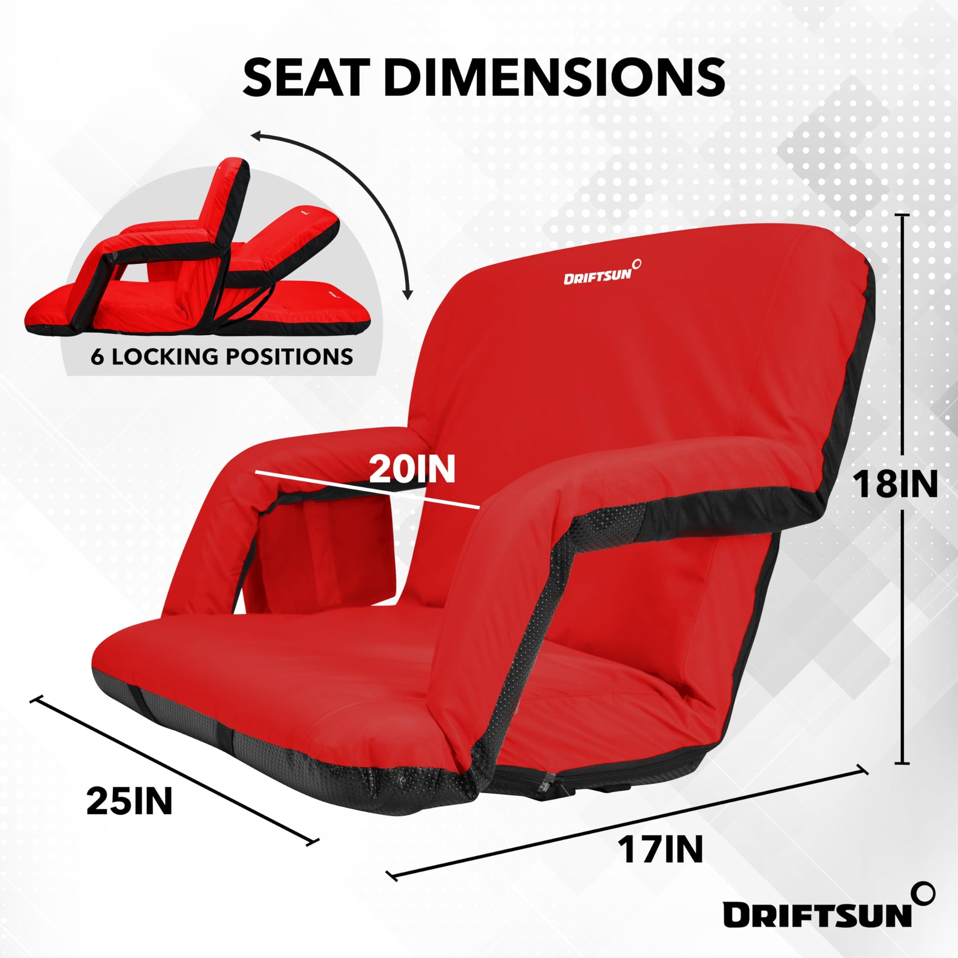 - PORTABLE STADIUM CHAIR - The Driftsun reclining bleacher seat with backrest has adjustable backpack straps to transport to the game without the hassle. Perfect for stadium seats, park benches, backyards, and picnics!