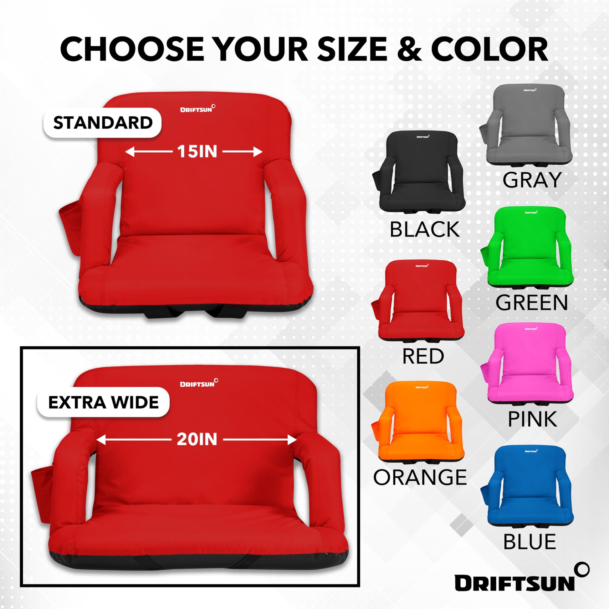 - EXTRA WIDE STADIUM SEAT - The Driftsun extra wide stadium chairs are 5 inches wider than the standard size for added room and comfort. These are the best stadium seats for bleachers with back support on the market.