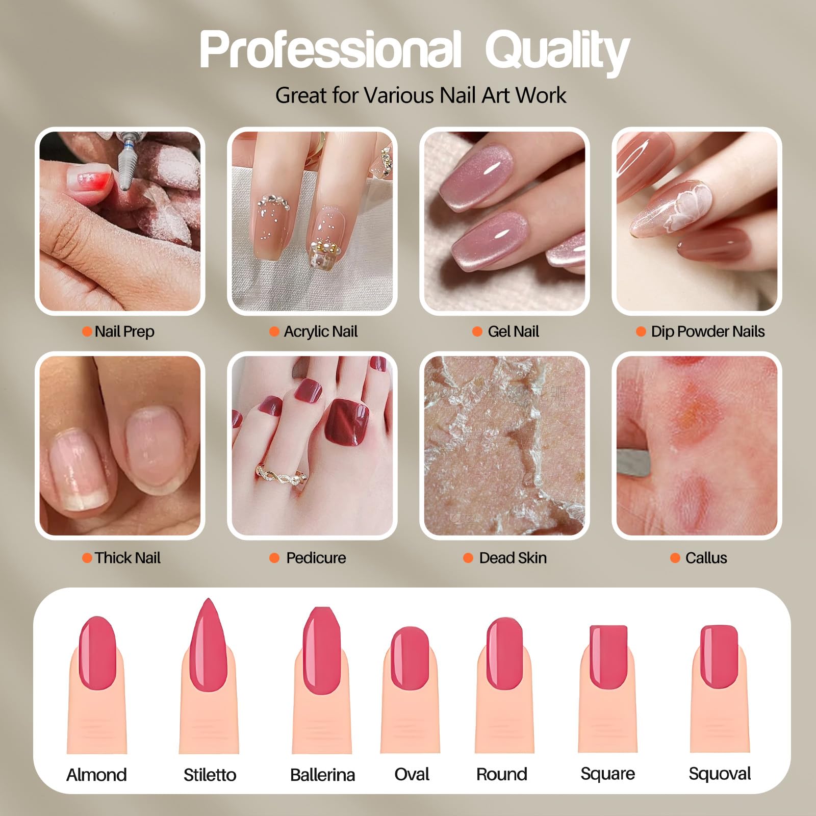 - Low Noise and Easy to Use: This nail drill features a compact and lightweight aluminum body design with high heat dissipation efficiency. High quality electric nail drills are equipped with high-quality bearings and motors to ensure smooth operation and low noise of electric nail files. It is suitable for both home use and salon use. Simply connect the power cord to start working.