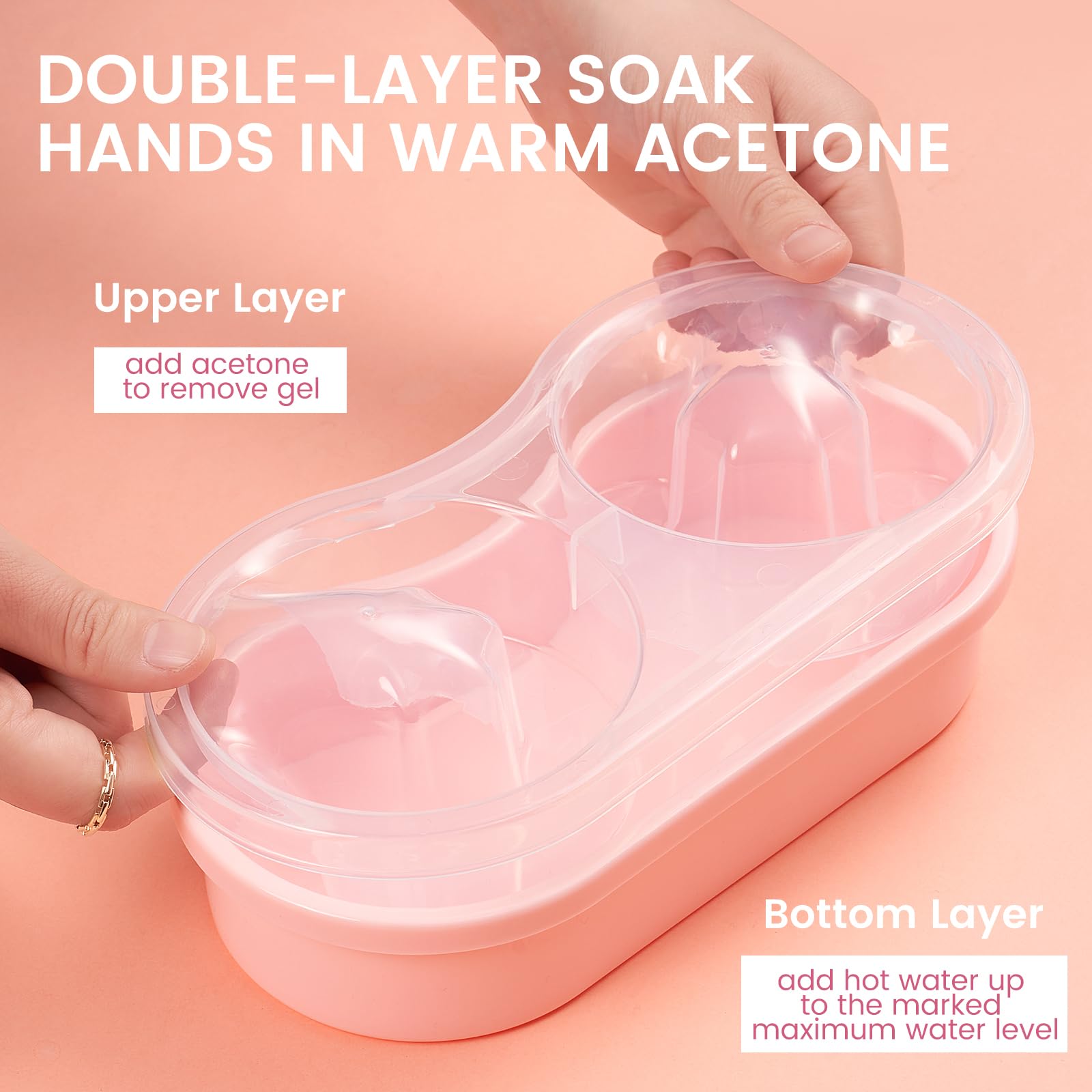- Simple Double-Layer Operation: The nail soak off bowl's double-layer design makes it easy to use. Simply fill the bottom layer with hot water up to the marked maximum water level, and the top layer with nail remover. The warm acetone in the top layer helps to quickly and effectively remove nail polish, while also providing a soothing hand spa experience