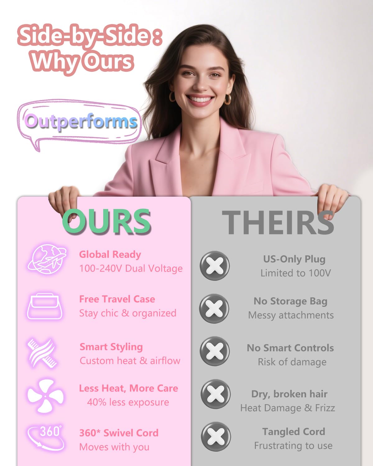 - Versatile Styling, Travel Essential: The Dual Voltage Hair Air Wrap Styler combines a fast drying dryer, auto air wrap, straightening brush, and volumizing styler into one compact tool. Eliminate the need for multiple appliances, saving you money, storage space, and time. Achieve salon-quality results effortlessly at home or business trips. Customizable nozzles adapt to all hair types and lengths , making it your ultimate all-in-one styling solution.