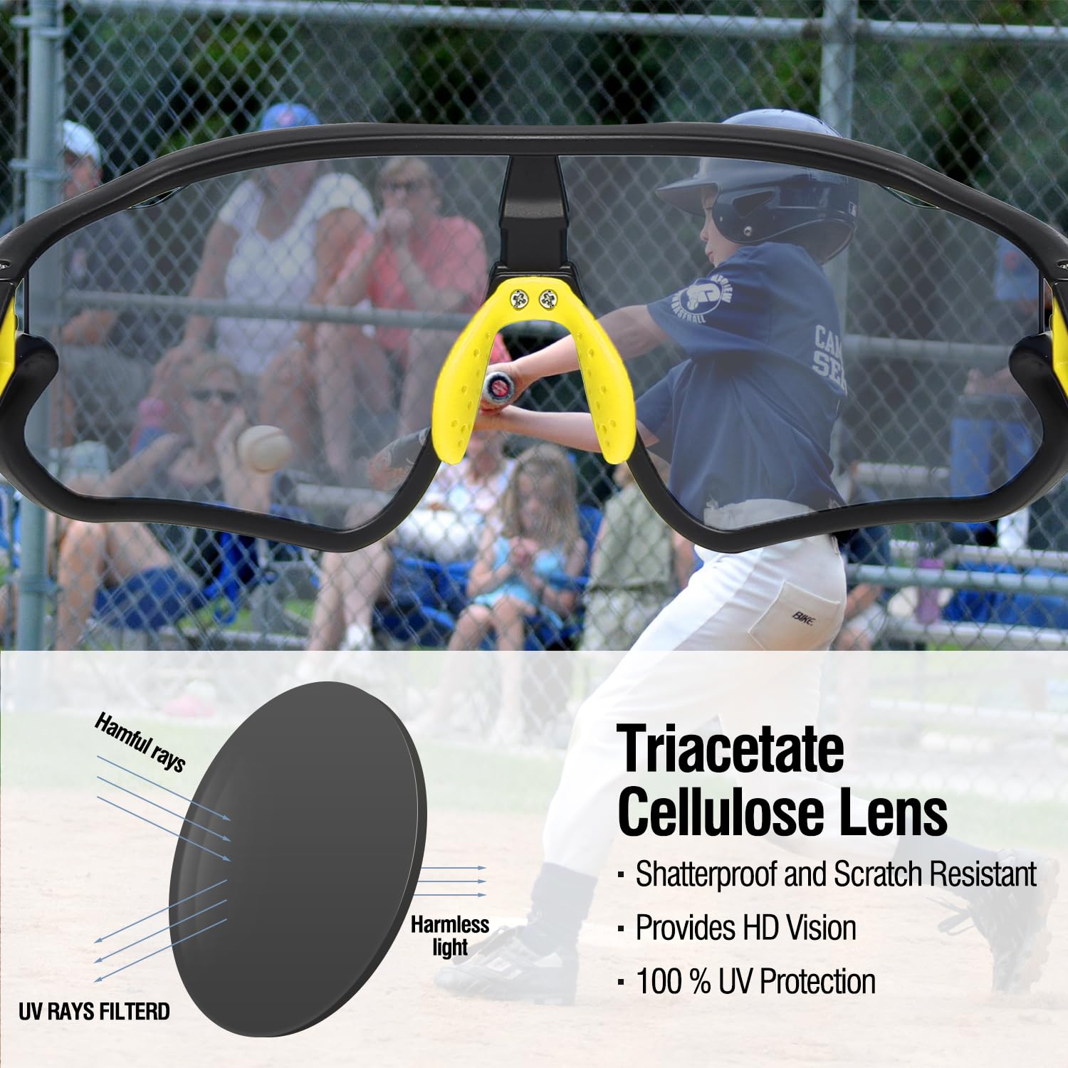 - 【DESIGNED FOR SPORTS】 -- These youth sports sunglasses offer 100% UV protection and clear vision,making them ideal for outdoor sports,such as baseball,softball,climbing,driving,fishing,golf,hiking,running skiing,cycling and so on.