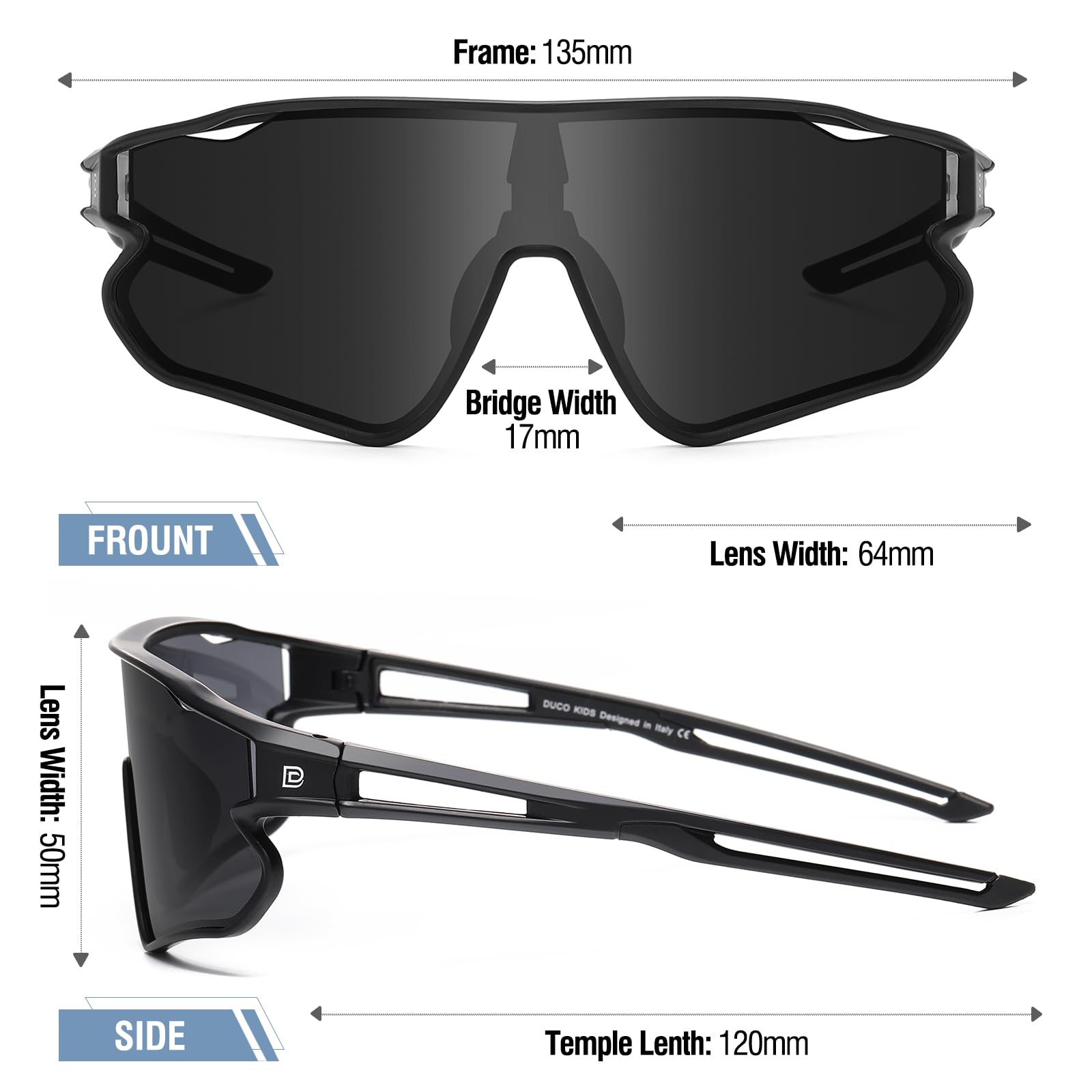 - 【ABOUT SIZE】DUCO kids sunglasses DK268 is suitable for age 8-16. For specific information as follows. Lens Width-64mm(2.52in) Lens Height-50mm(1.96in) Bridge Width-17mm(0.66in) Frame Width-135mm(5.31in) Temple Length-120mm(4.72in)