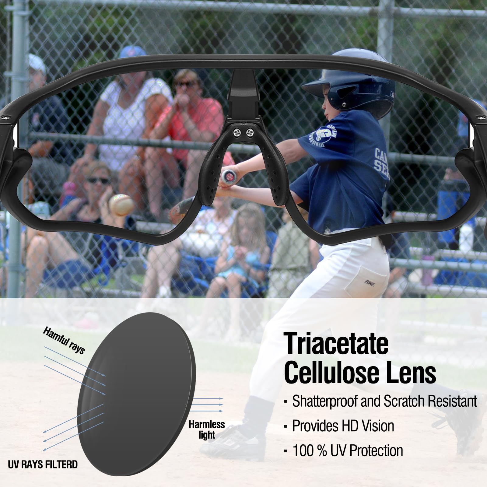 - 【DESIGNED FOR SPORTS】 -- These youth sports sunglasses offer 100% UV protection and clear vision,making them ideal for outdoor sports,such as baseball,softball,climbing,driving,fishing,golf,hiking,running skiing,cycling and so on.