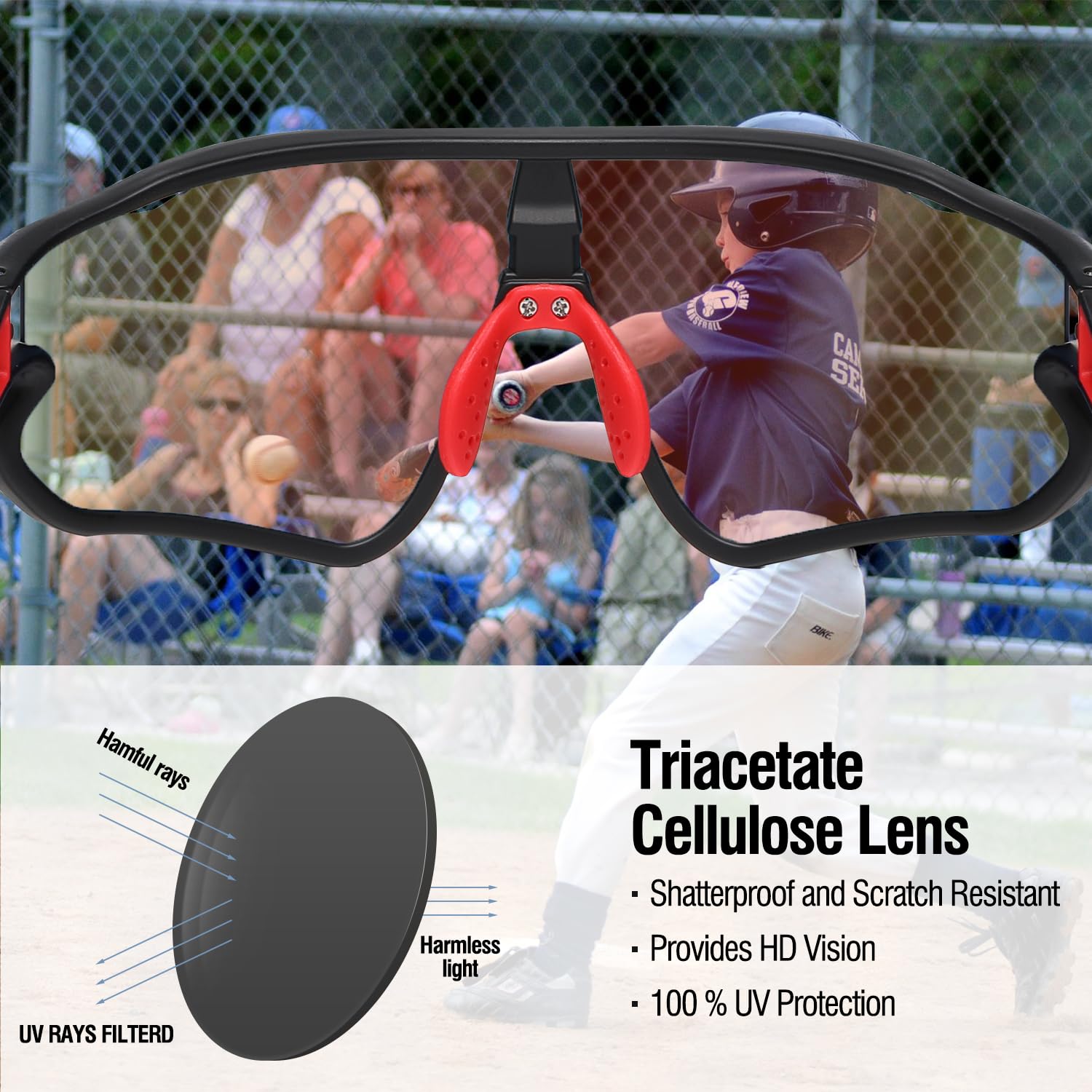 - 【DESIGNED FOR SPORTS】 -- These youth sports sunglasses offer 100% UV protection and clear vision,making them ideal for outdoor sports,such as baseball,softball,climbing,driving,fishing,golf,hiking,running skiing,cycling and so on.