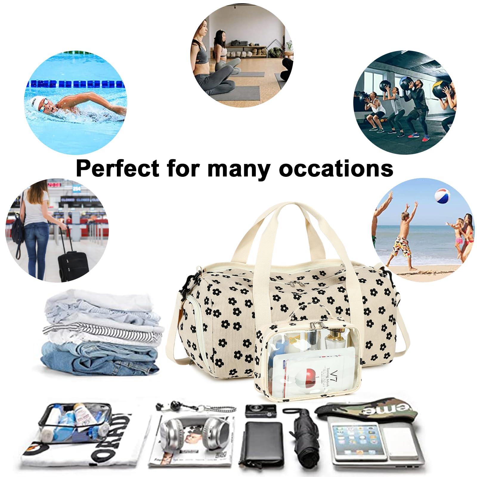 Duffle Bag for Gym Sports Women Girls Workout Travel Bag Weekender with Shoe Compartment and Wet Pocket (2-Corduroy-Black floral)