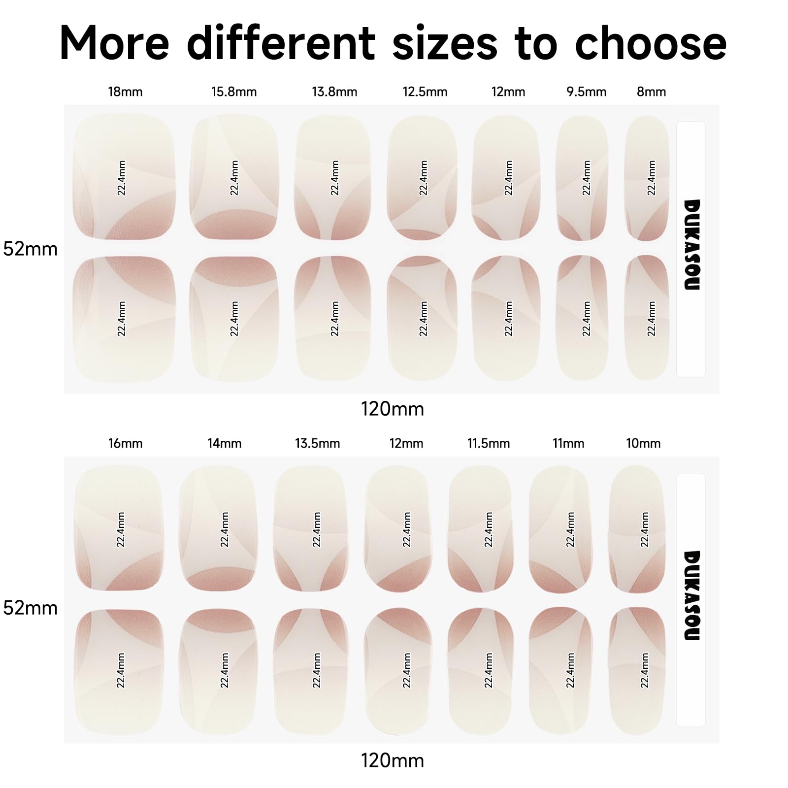 - Gel nail stickers set: DUKASOU semi cured gel nail strips package contains 28 stickers in 14 different sizes, it comes with 2 prep pads, 1 nail file, and 1 wooden stick (pressing the edge and removing), suitable for all nail sizes and shapes