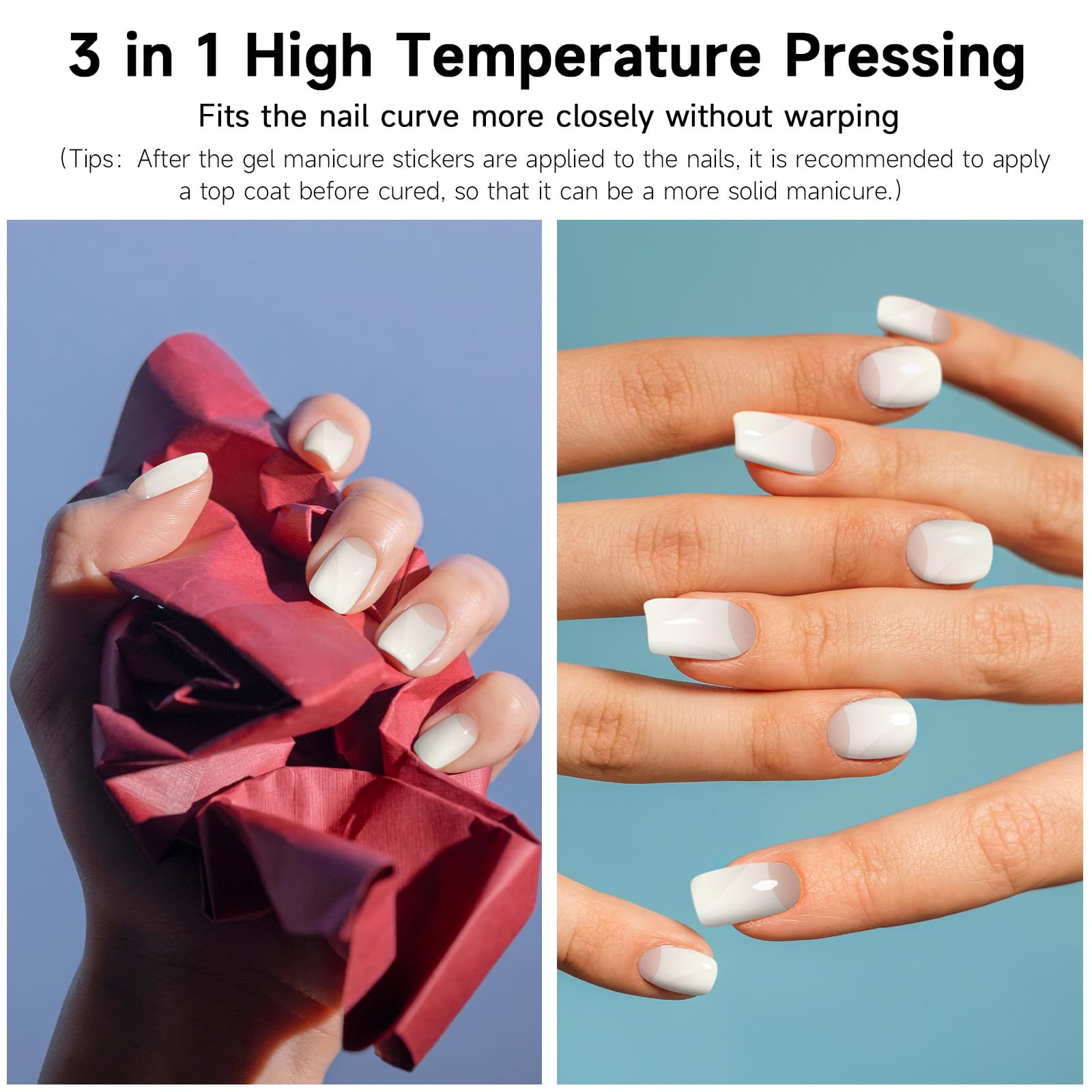 - DIY nails in 20 mins: polished and clean the nail surface, choose a smaller size than the nail surface, pressed tightly the entire nail surface and the edge, cut off the excess part, curing 60s, after cooling 20s, polish the fingertips will keep 2 weeks