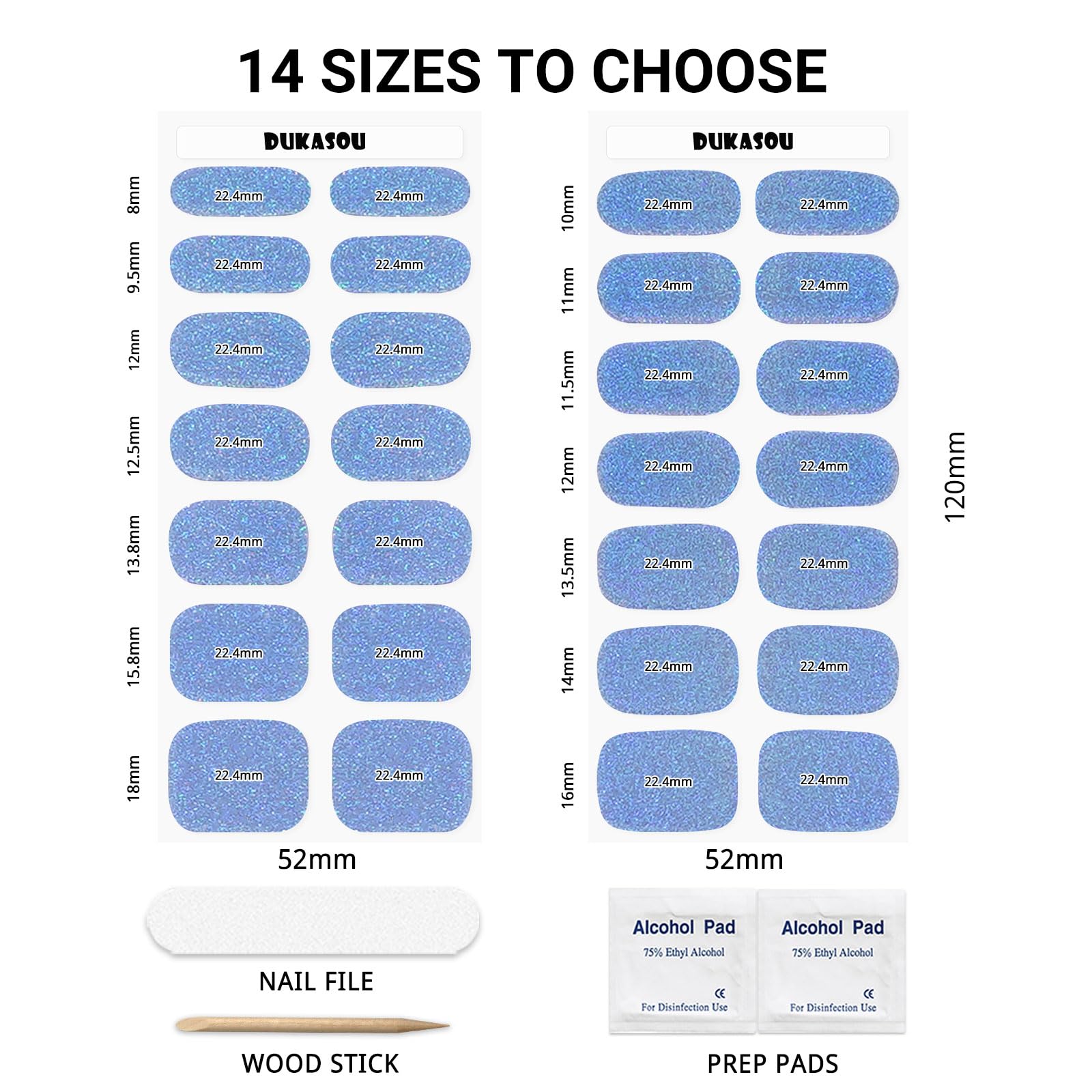 - Gel nail stickers set: DUKASOU semi cured gel nail strips package contains 28 stickers in 14 different sizes, it comes with 2 prep pads, 1 nail file, and 1 wooden stick (pressing the edge and removing), suitable for all nail sizes and shapes