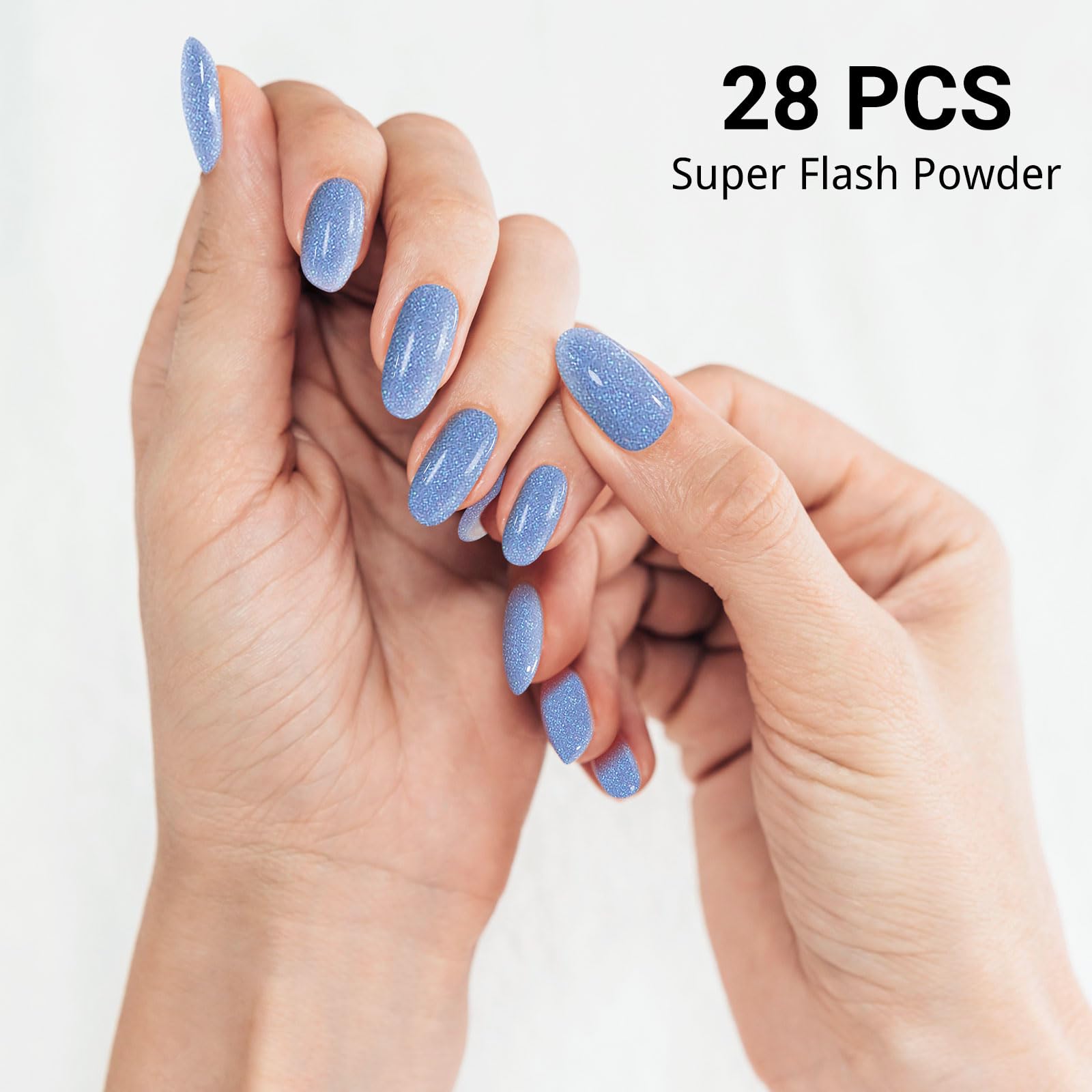 DUKASOU Semi Cured Gel Nail Strips, Blue Fine Flash | 28pcs Gel Nail Strips Work with Any uv lamp,Gel Nail Stickers for Women Girls, Includes Prep Pads, Nail File & Wood Stick