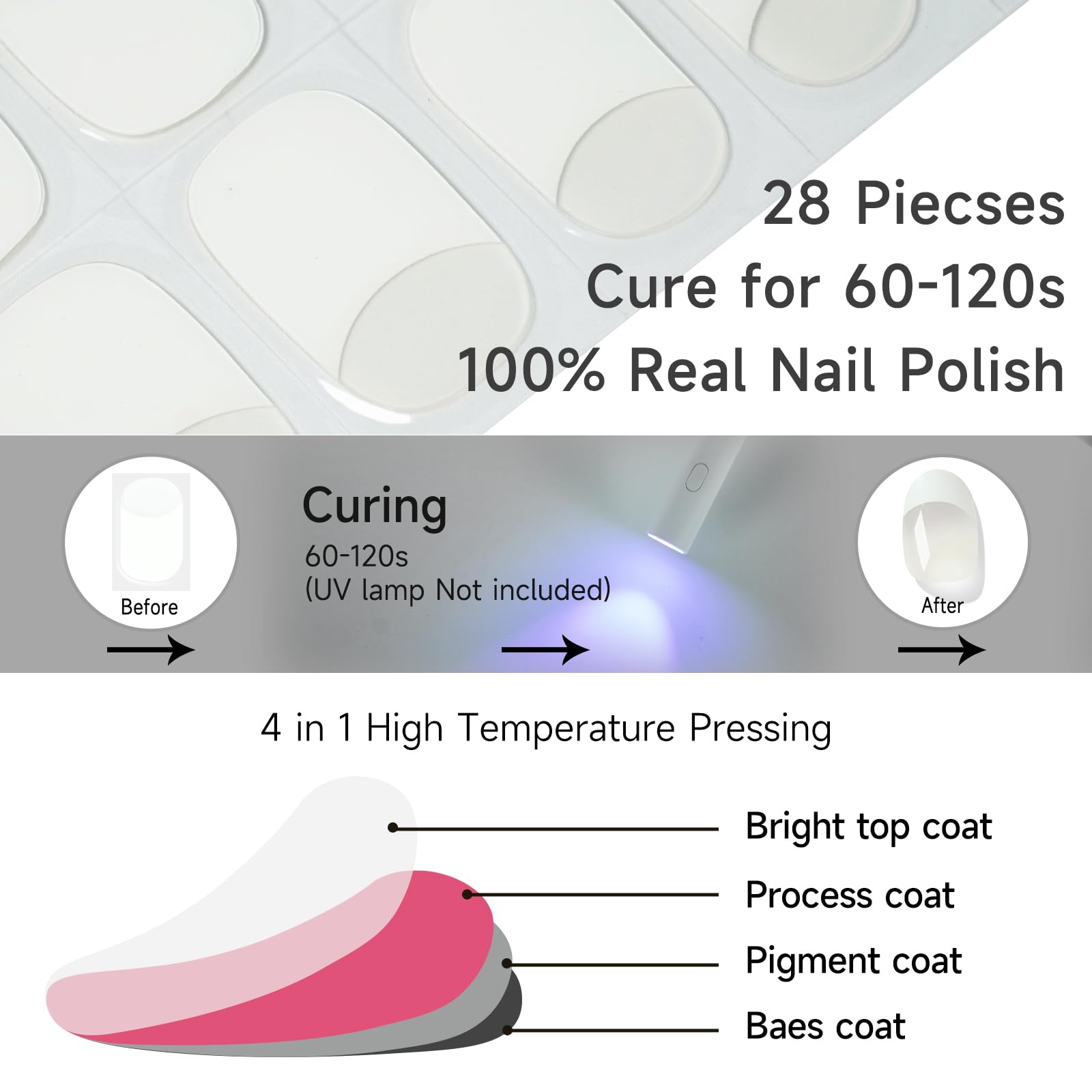 - DIY nails in 20 mins: polished and clean the nail surface, choose a smaller size than the nail surface, pressed tightly the entire nail surface and the edge, cut off the excess part, curing 60s, after cooling 20s, polish the fingertips will keep 2 weeks