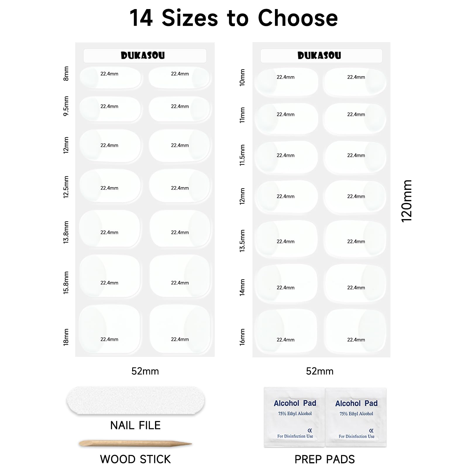 - Gel nail stickers set: DUKASOU semi cured gel nail strips package contains 28 stickers in 14 different sizes, it comes with 2 prep pads, 1 nail file, and 1 wooden stick (pressing the edge and removing), suitable for all nail sizes and shapes