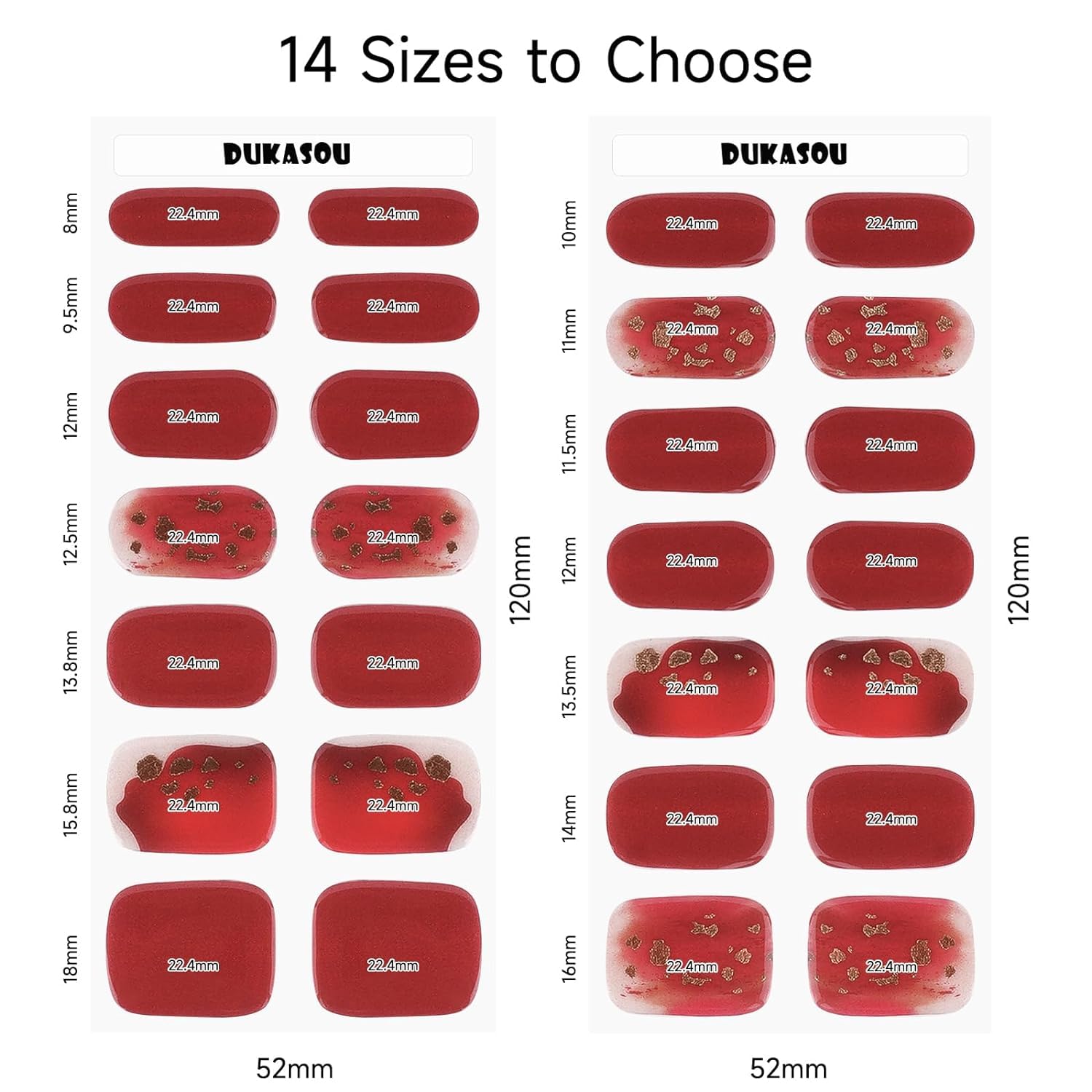 - Gel nail stickers set: DUKASOU semi cured gel nail strips package contains 28 stickers in 14 different sizes, it comes with 2 prep pads, 1 nail file, and 1 wooden stick (pressing the edge and removing), suitable for all nail sizes and shapes