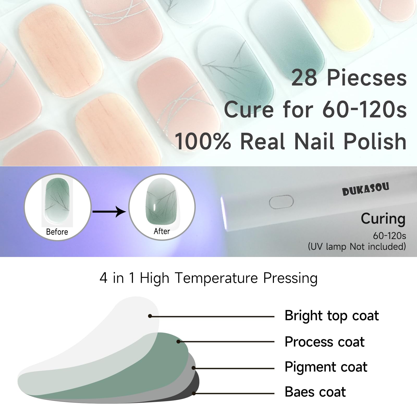 DUKASOU Semi Cured Gel Nail Strips, Green Jade | 28 pcs Chinese Style Gel Nail Strips Work with Any UV Lamp, Salon Quality New Chinese Nail Stickers, Include Prep Pads, Nail File&Wood Stick