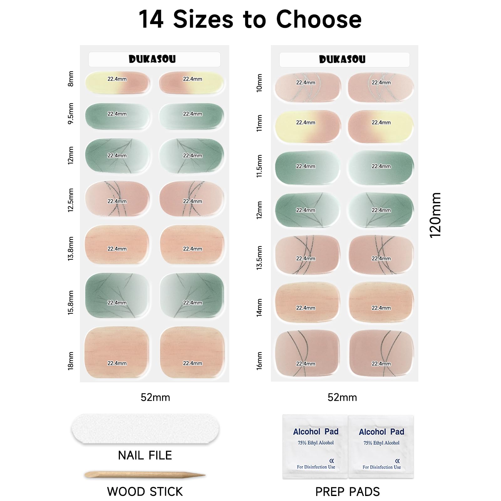 - Gel nail stickers set: DUKASOU semi cured gel nail strips package contains 28 stickers in 14 different sizes, it comes with 2 prep pads, 1 nail file, and 1 wooden stick (pressing the edge and removing), suitable for all nail sizes and shapes