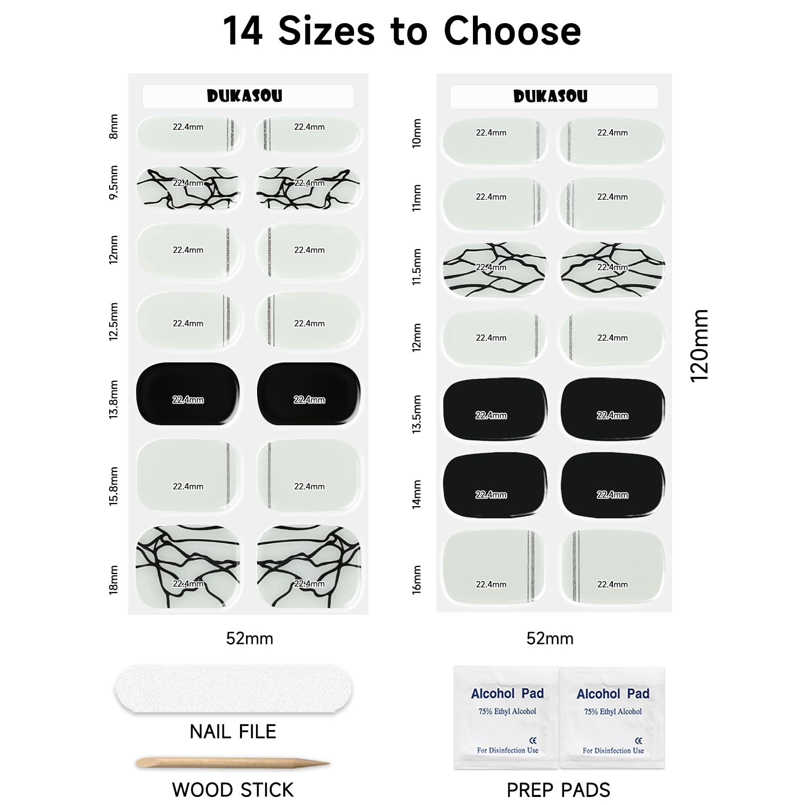 - Gel nail stickers set: DUKASOU semi cured gel nail strips package contains 28 stickers in 14 different sizes, it comes with 2 prep pads, 1 nail file, and 1 wooden stick (pressing the edge and removing), suitable for all nail sizes and shapes