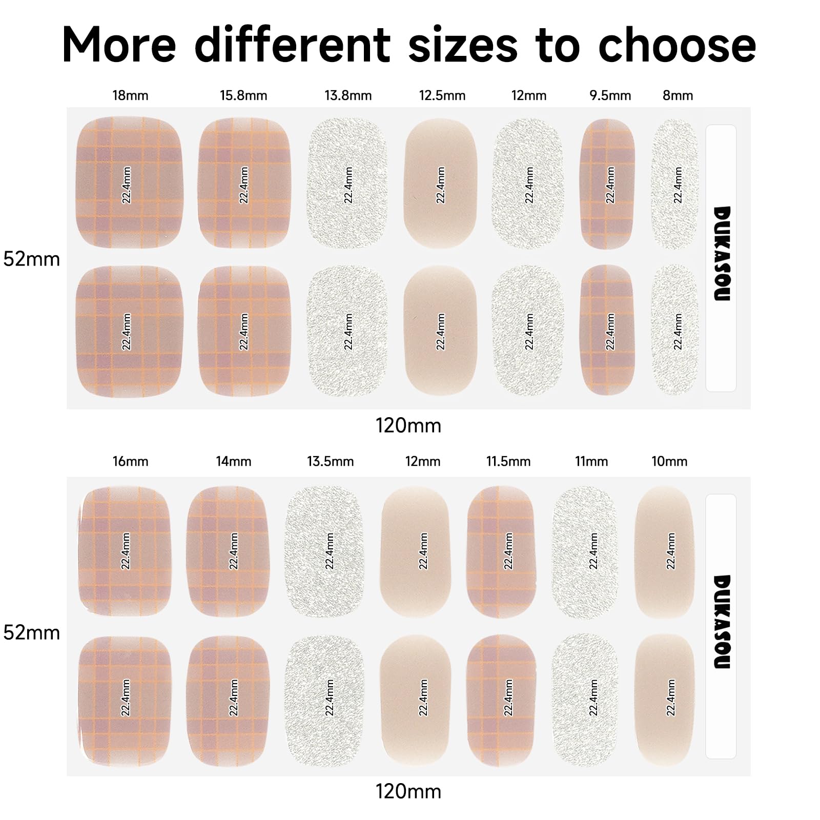 - Gel nail stickers set: DUKASOU semi cured gel nail strips package contains 28 stickers in 14 different sizes, it comes with 2 prep pads, 1 nail file, and 1 wooden stick (pressing the edge and removing), suitable for all nail sizes and shapes