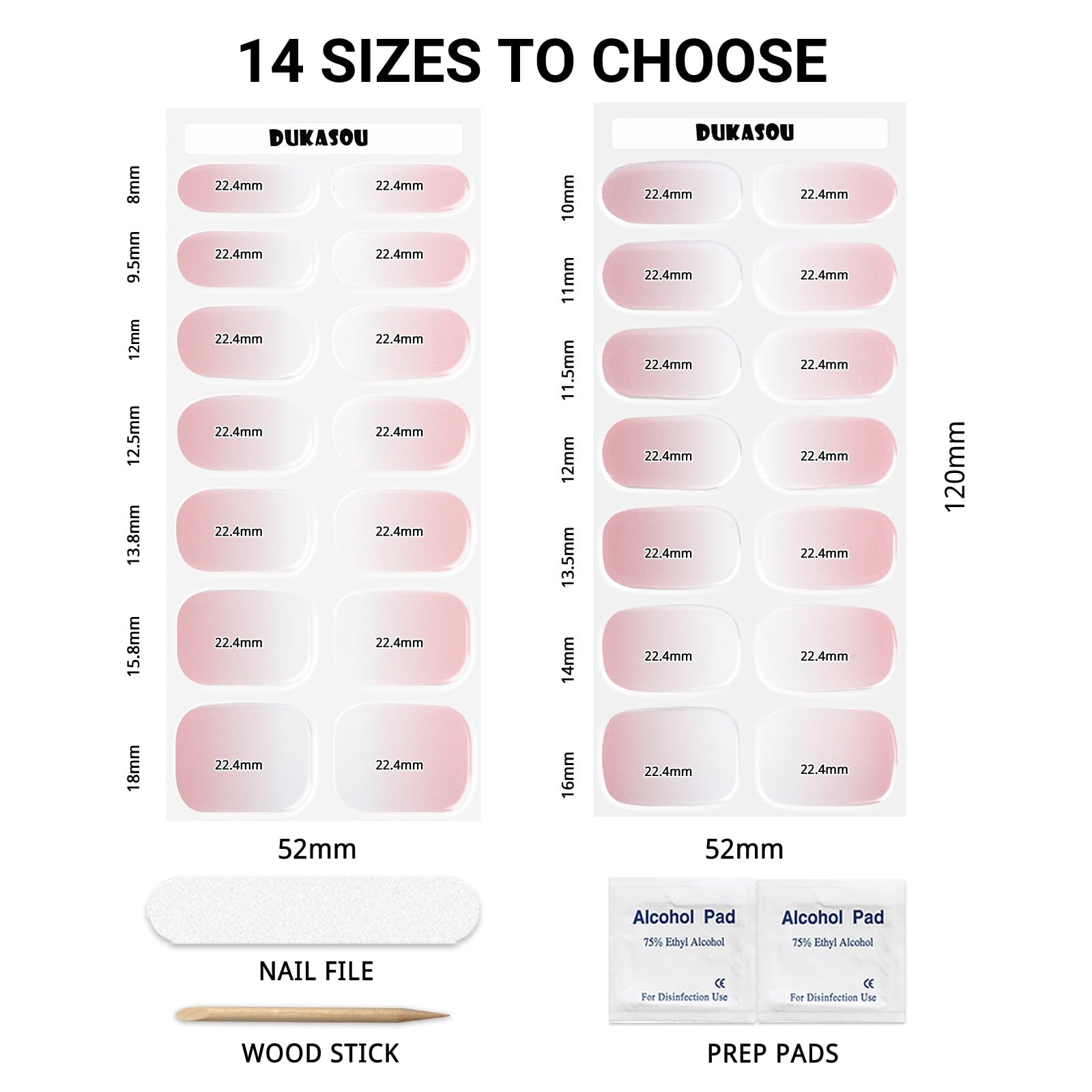 - Gel nail stickers set: DUKASOU semi cured gel nail strips package contains 28 stickers in 14 different sizes, it comes with 2 prep pads, 1 nail file, and 1 wooden stick (pressing the edge and removing), suitable for all nail sizes and shapes