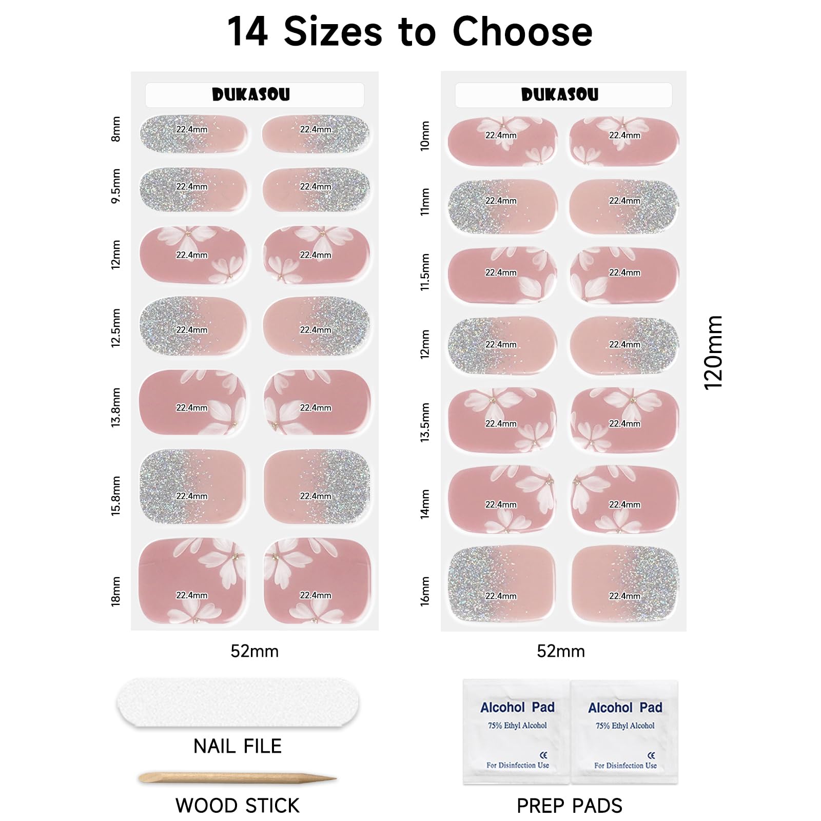- Gel nail stickers set: DUKASOU semi cured gel nail strips package contains 28 stickers in 14 different sizes, it comes with 2 prep pads, 1 nail file, and 1 wooden stick (pressing the edge and removing), suitable for all nail sizes and shapes
