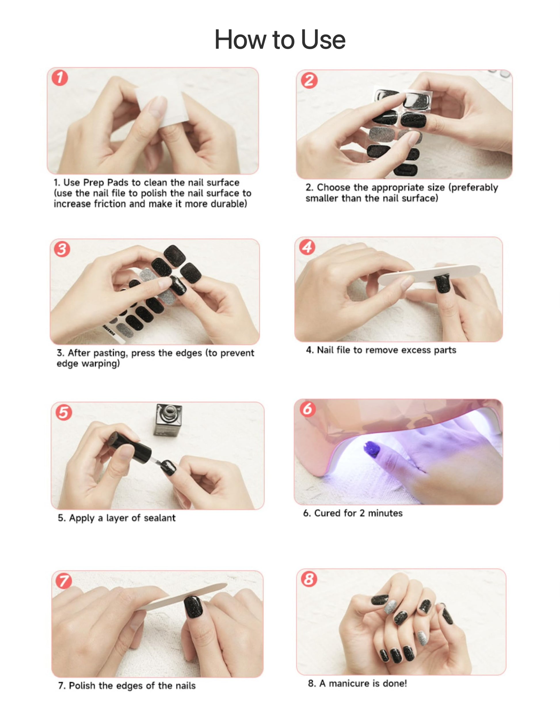 - DIY nails in 20 mins: polished and clean the nail surface, choose a smaller size than the nail surface, pressed tightly the entire nail surface and the edge, cut off the excess part, curing 60s, after cooling 20s, polish the fingertips will keep 2 weeks