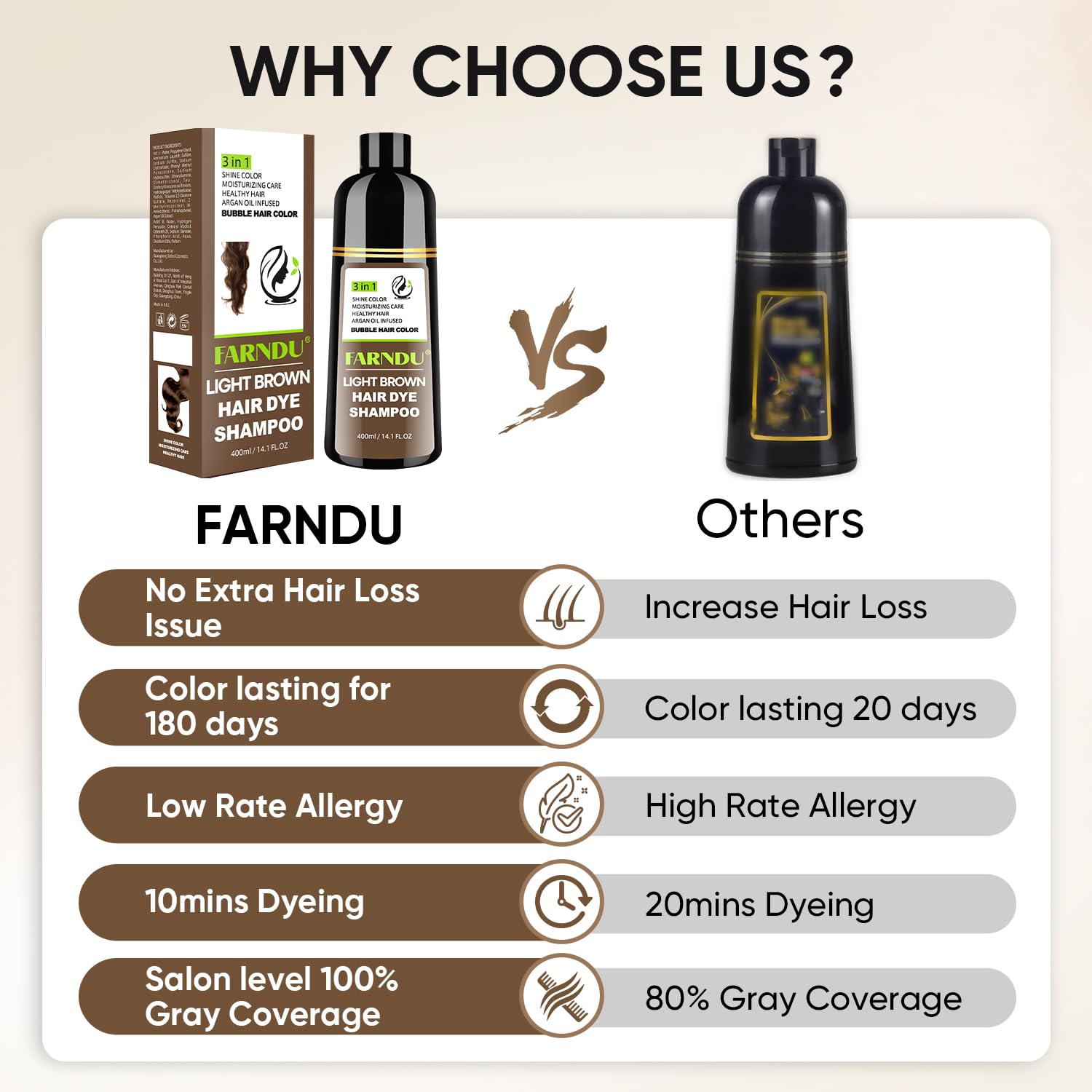 DYEING 221 BC FARNDU Light Brown Hair Dye Shampoo for Gray Hair Coverage - 3 In 1 Natural Hair Color Shampoo for Women & Men, Champu Para Canas Mujer