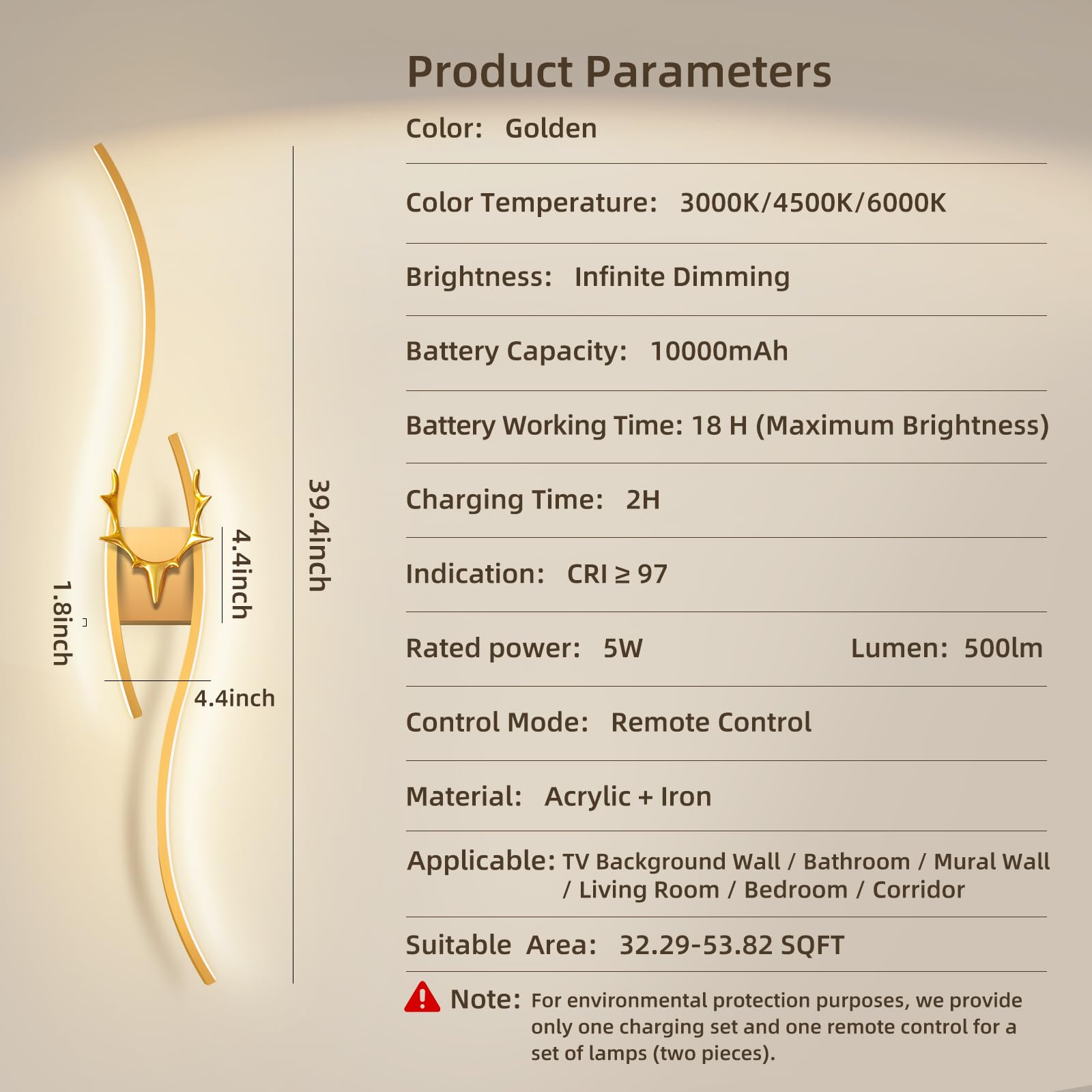 DZW 39.3'' Battery Operated Natural Light Spectrum Wall Sconces Set of Two,Touch & Remote Controll, 3000K-6000K & Dimming, LED Gold Cordless Wall Light for Living Room, Hallway, Bedroom