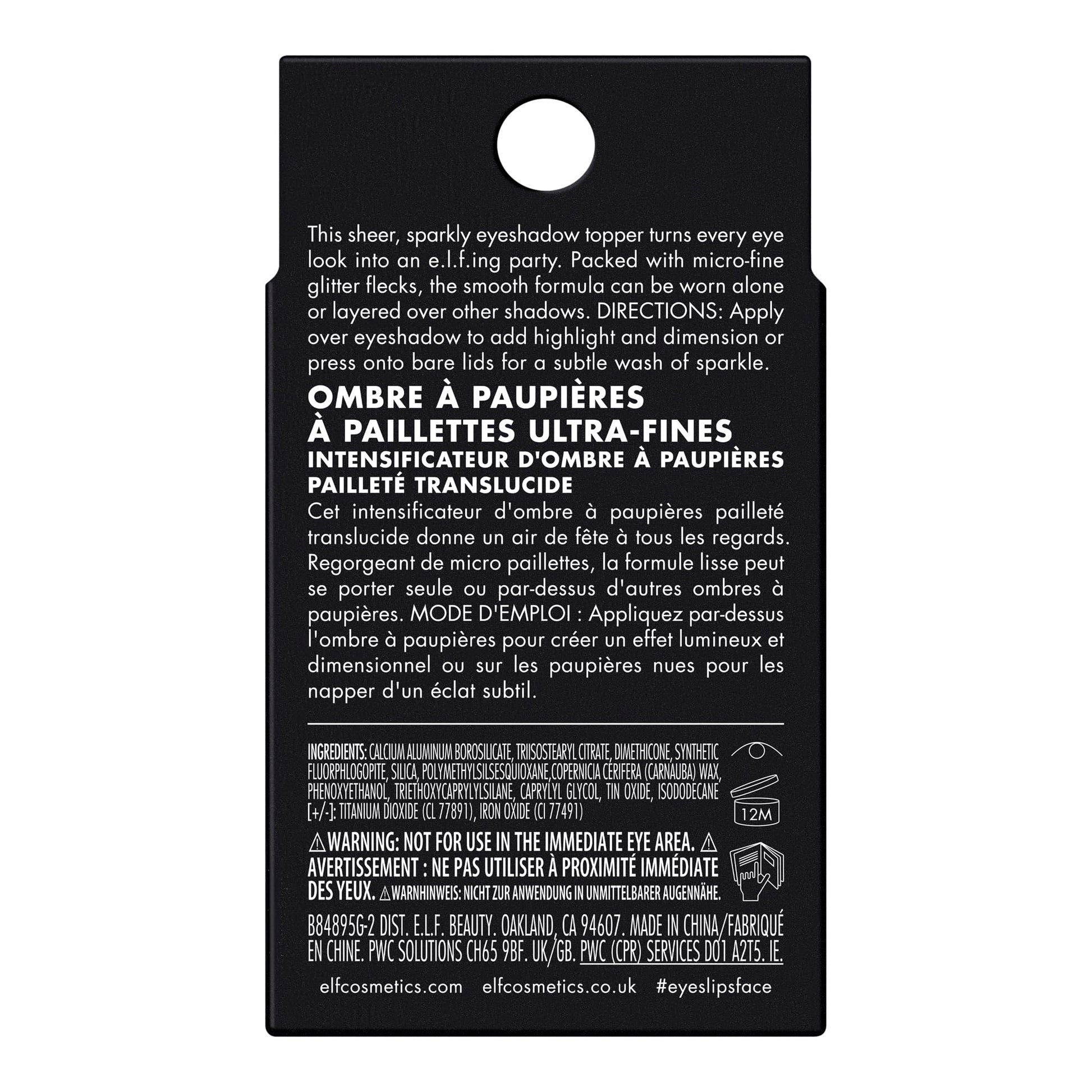 Details: What it is: Turn every eye look into a party with e.l.f. Cosmetics Fine as Fleck Glitter Eyeshadow! This sheer, dazzling eyeshadow topper is packed with micro-fine glitter flecks to play up your eyes with a mesmerizing wash of sparkle.