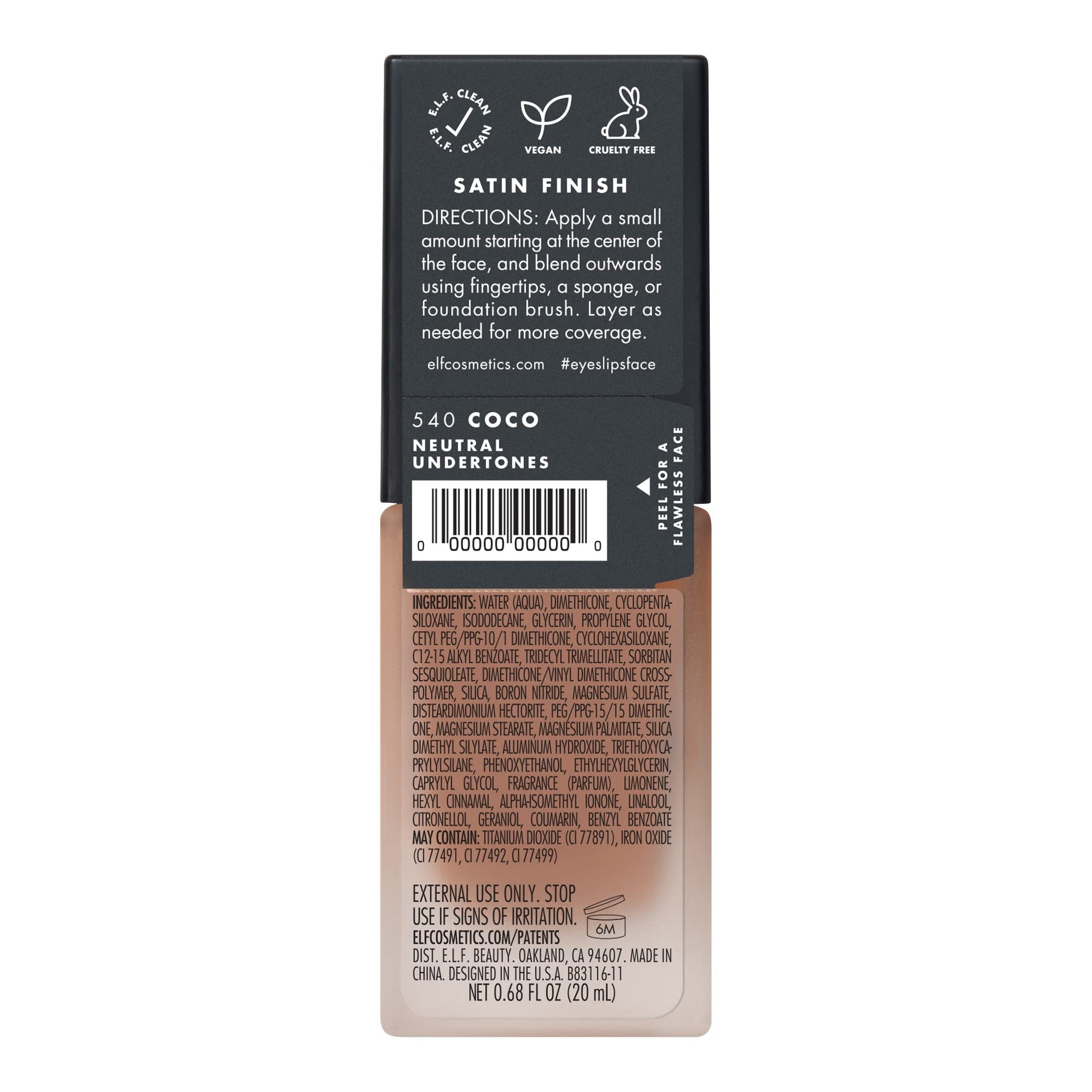 e.l.f. Flawless Satin Foundation, Lightweight & Medium Coverage, Semi-Matte Finish, Vegan & Cruelty-Free, Coco, 0.68 Fl Oz (20mL)