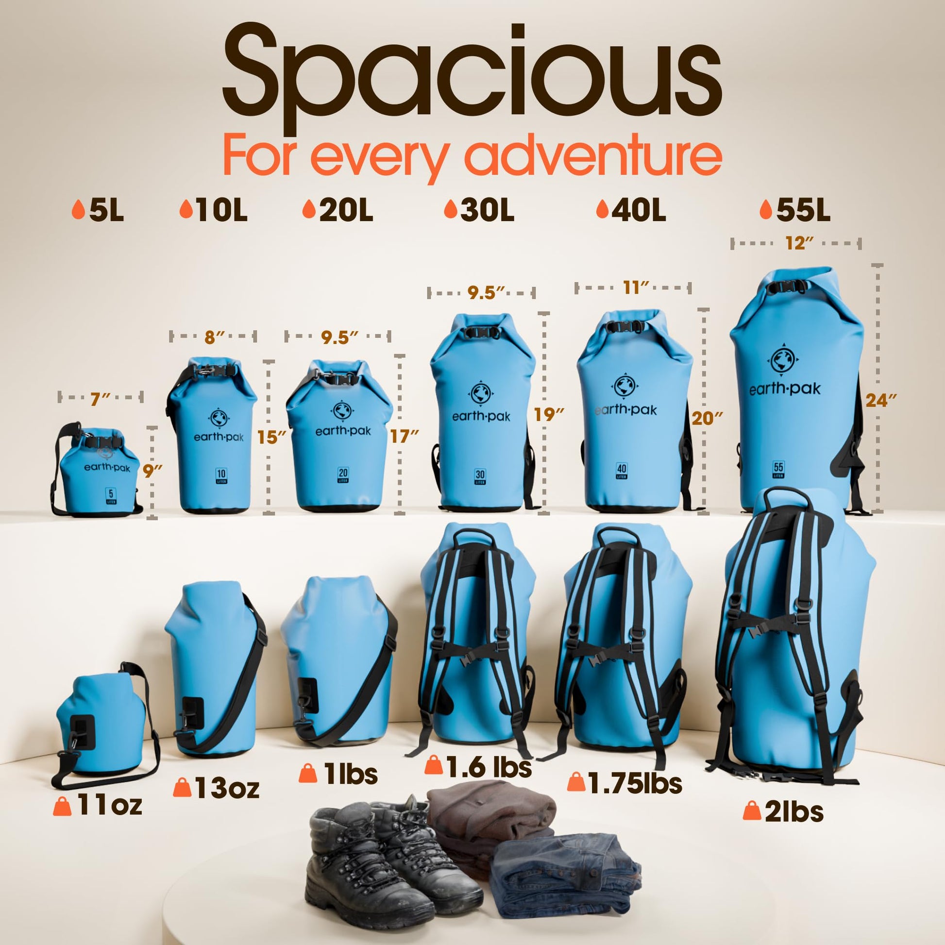 - Shoulder Strap: 10L & 20L dry bags come with a 24-42 Inch single shoulder strap. 30L, 40L, and 55L waterproof backpacks are equipped with backpack style shoulder straps that also come with a sternum strap for added stability. Our new 55L also comes equipped with a heavy duty waist-belt, which relieves added pressure and helps support your load.
