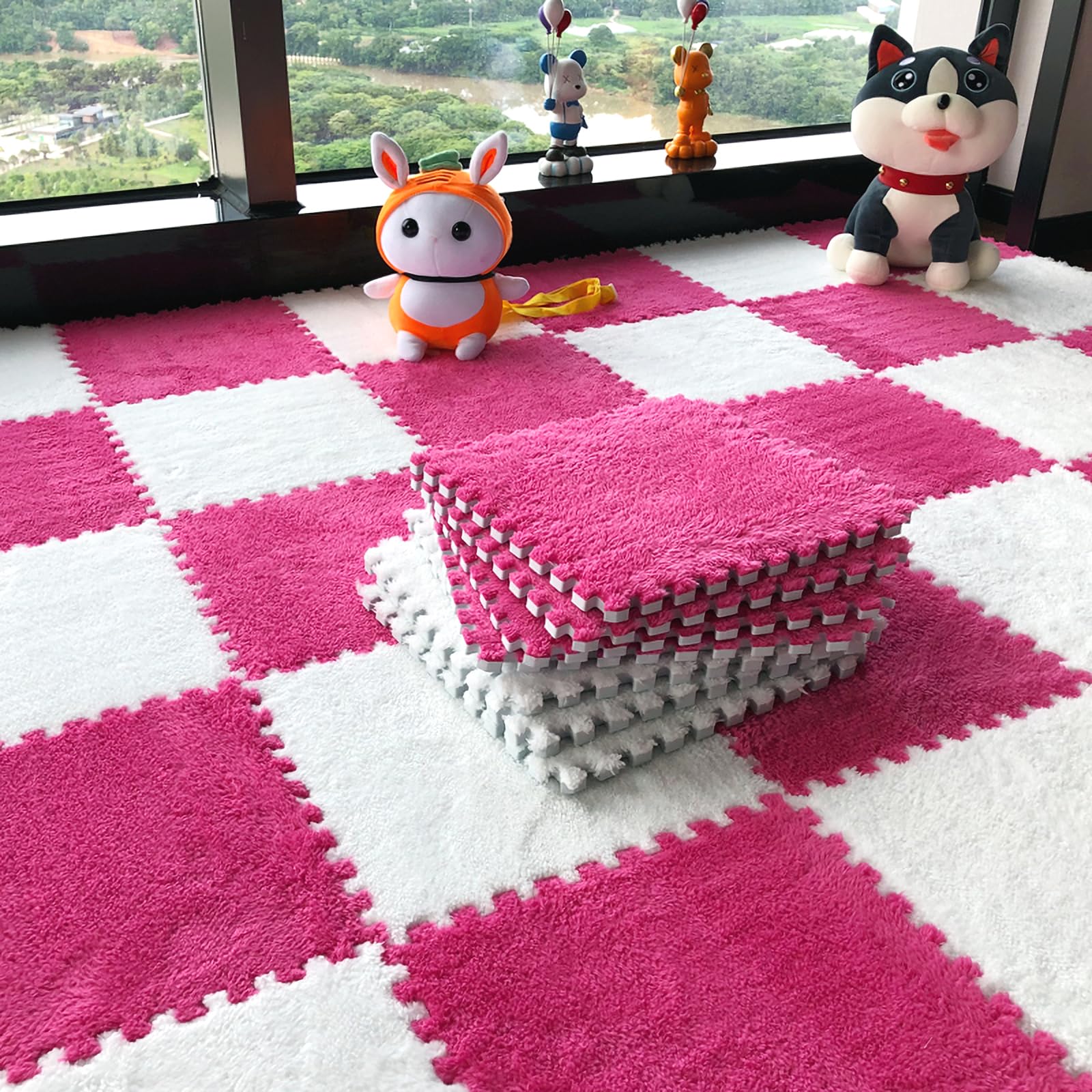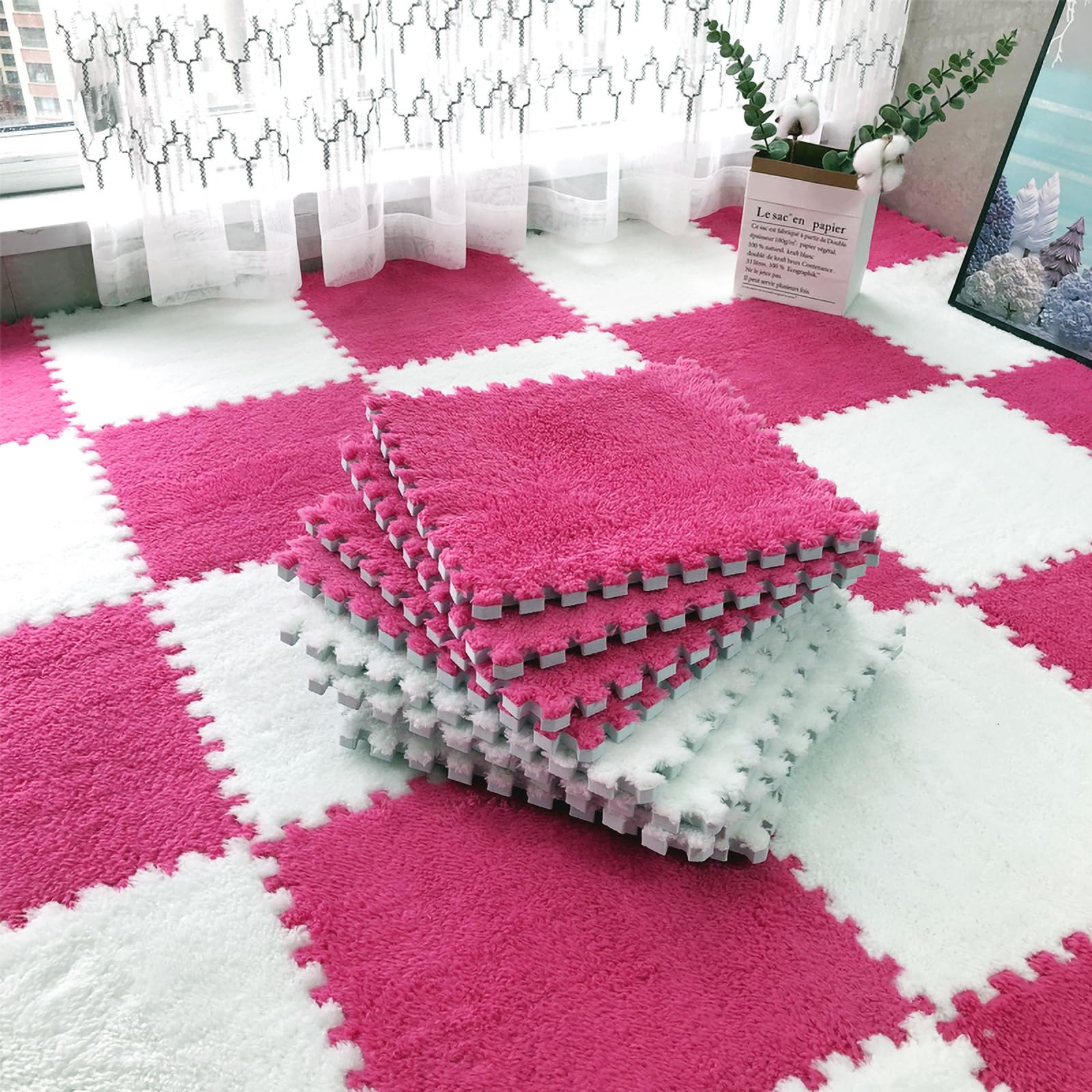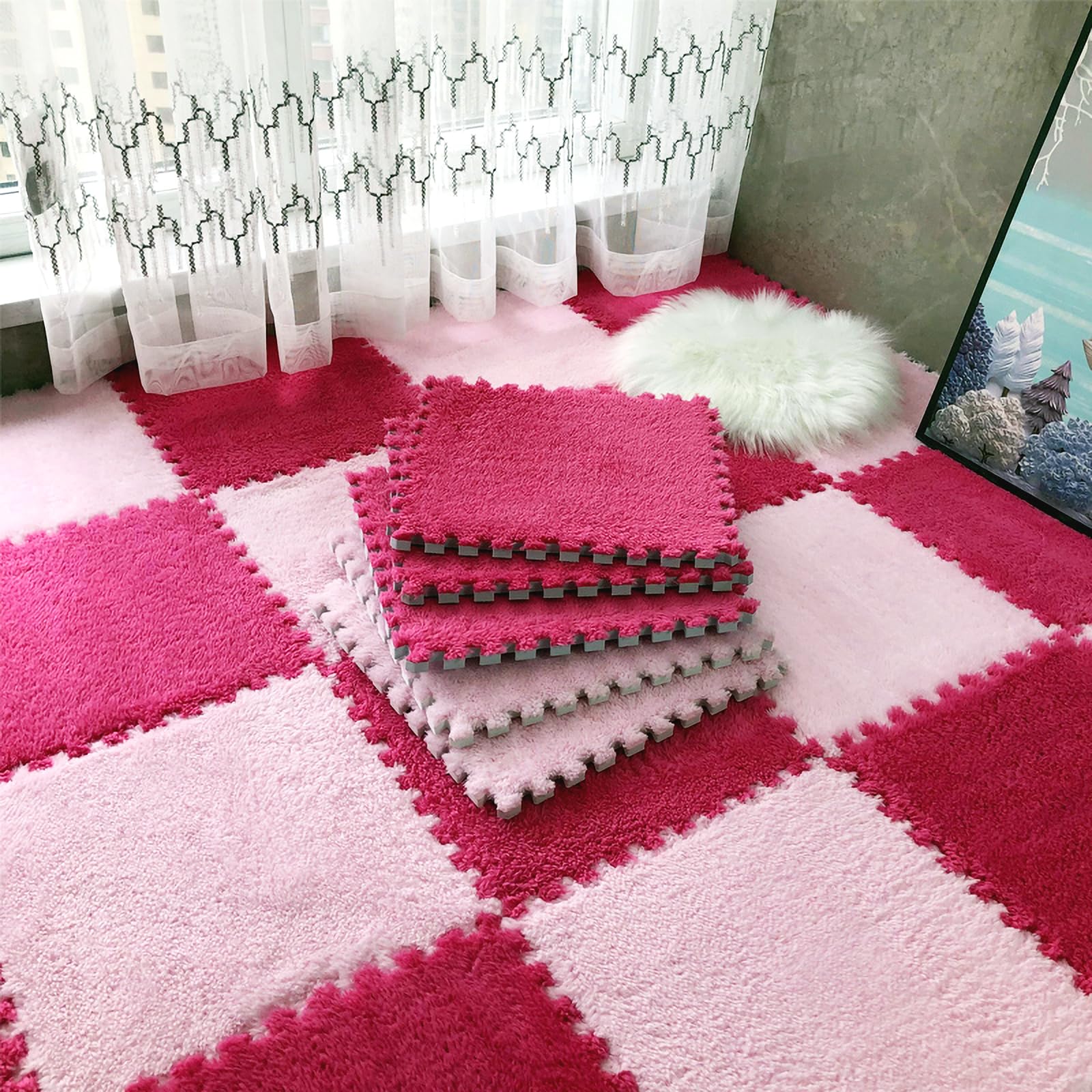 easycustomerlee 12pcs Interlocking Carpet Shaggy Soft EVA Foam Mats Fluffy Rugs Protective Floor Tiles Play Mats for Children Kids Room Home Parlor Bedroom(Rose)
